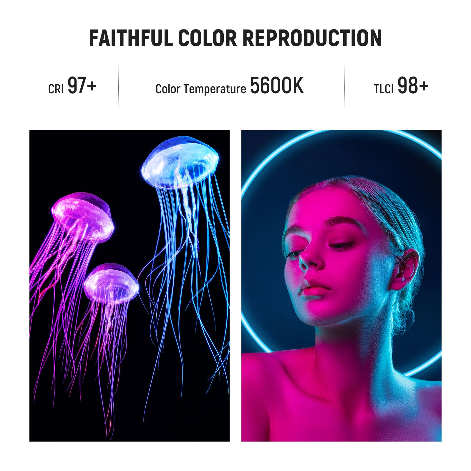 - Excellent Color Fidelity- With consistent 5600K color temperature, a high CRI of 97+, and a high TLCI of 98+, WP12 ensures flawless color rendition throughout the whole dimming range. The translucent CTO and CTB gel filters also transform the light to warmer colors or help with color correction