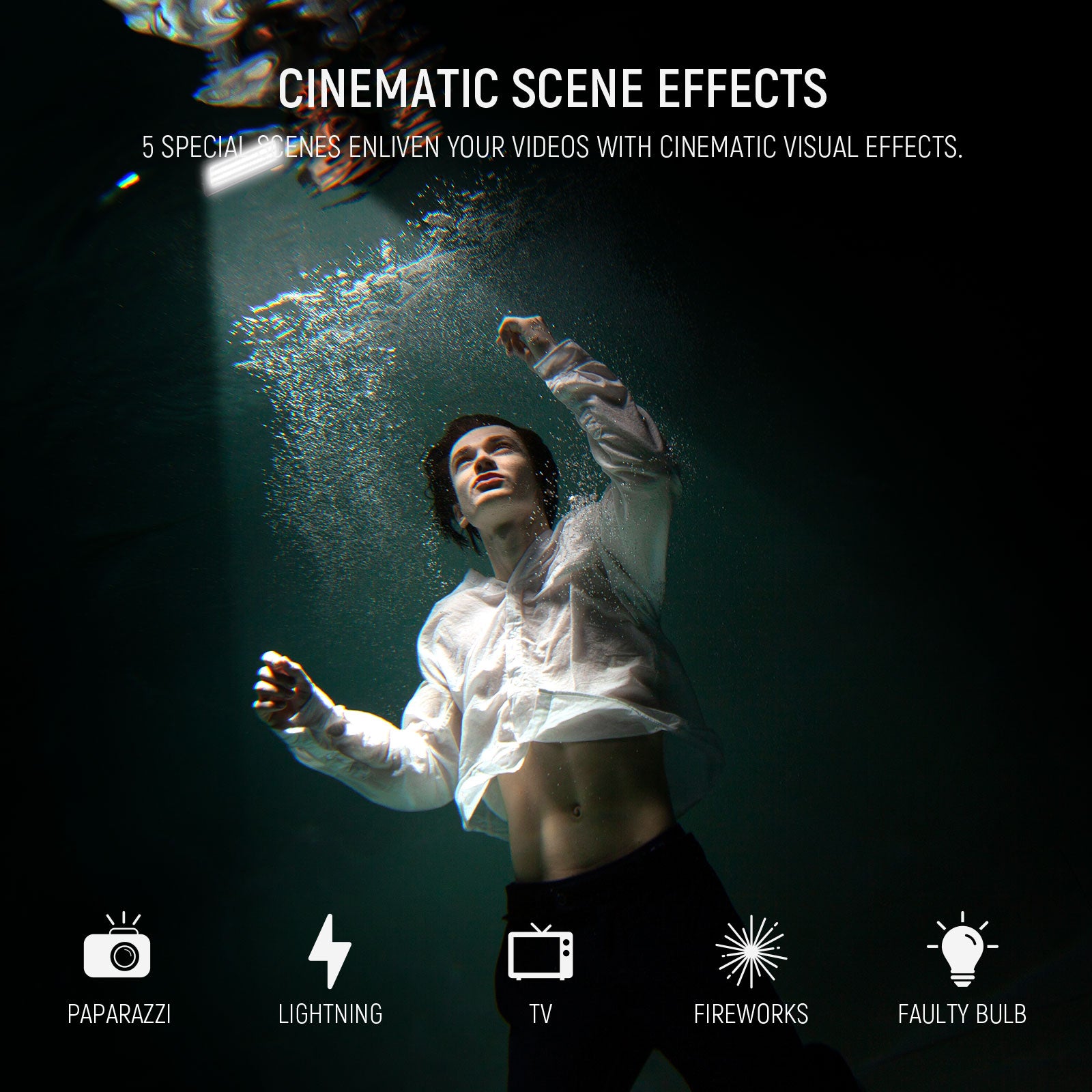 - Cinematic Scene Effects- 5 special effects simulated from real life can elevate video creation with offbeat elements. Select one from the following effects and take your videos to the next level: Lightning, TV, Paparazzi, Faulty Bulb, and Fireworks