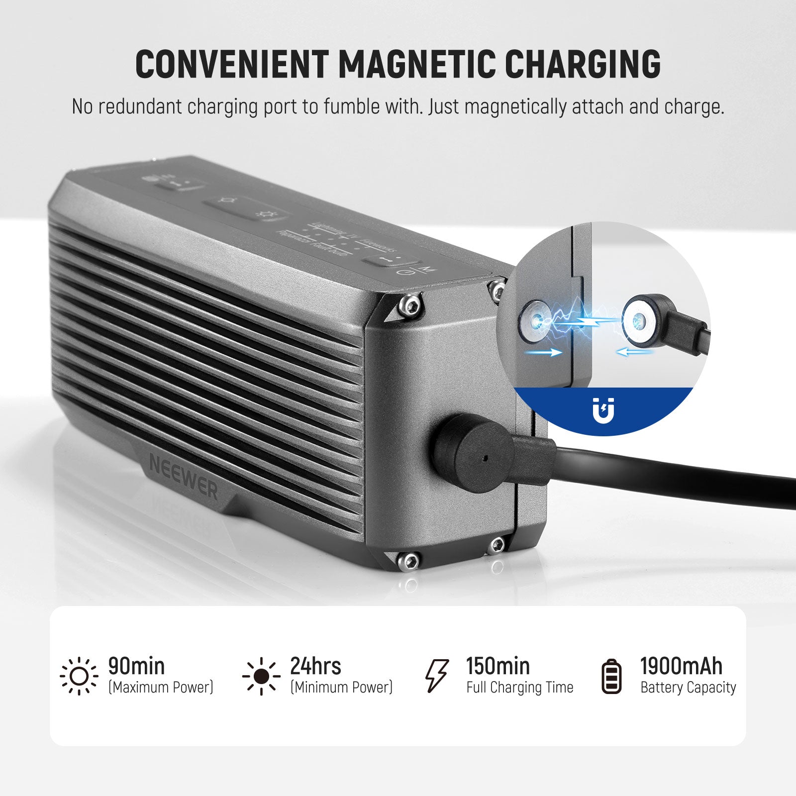 - Safe Magnetic Charging- Employing advanced magnetic charging technology, WP12 is safer and more convenient to charge. The 1900mAh rechargeable battery lasts 90min at the maximum power and 24hrs at the minimum power, and only takes 150min to get fully charged