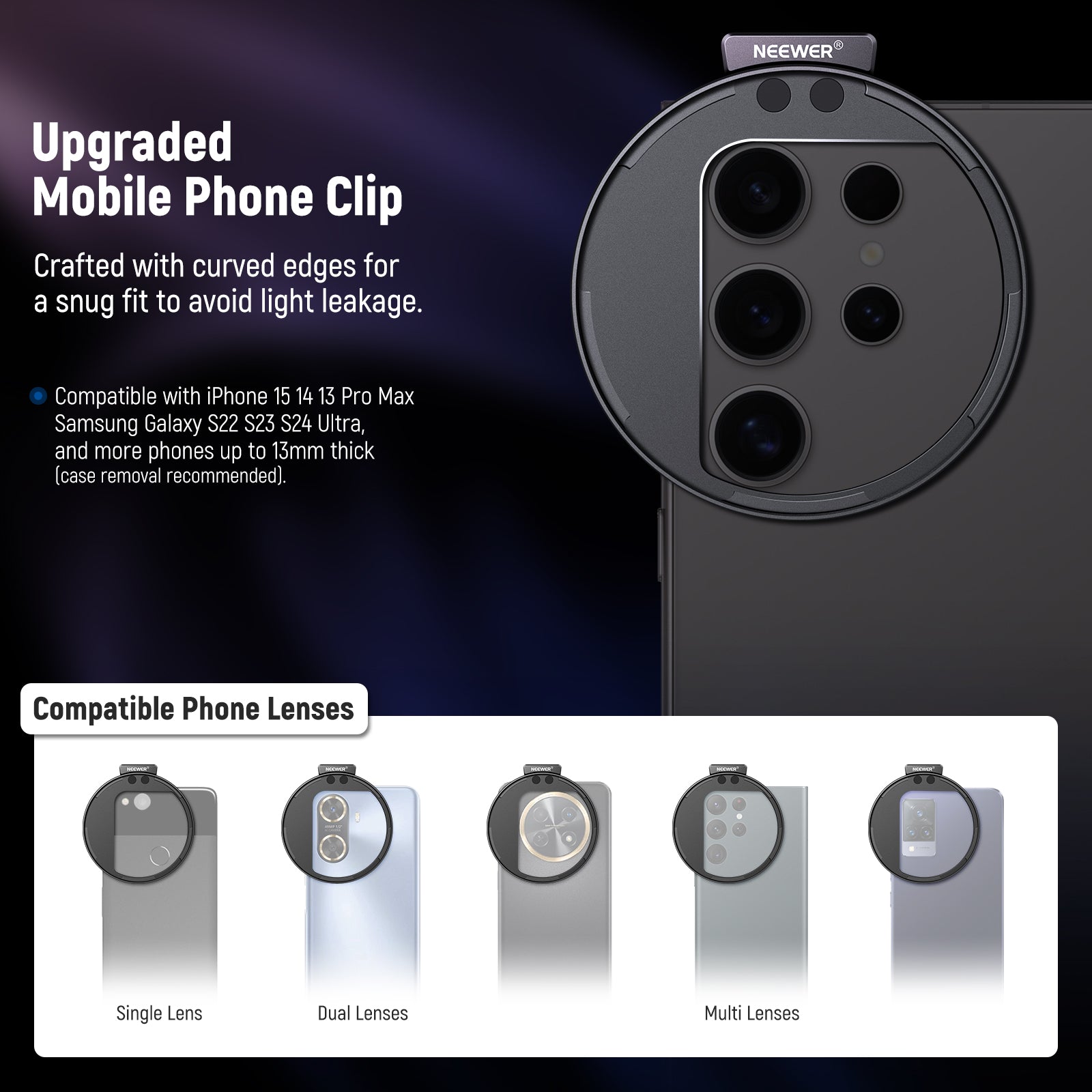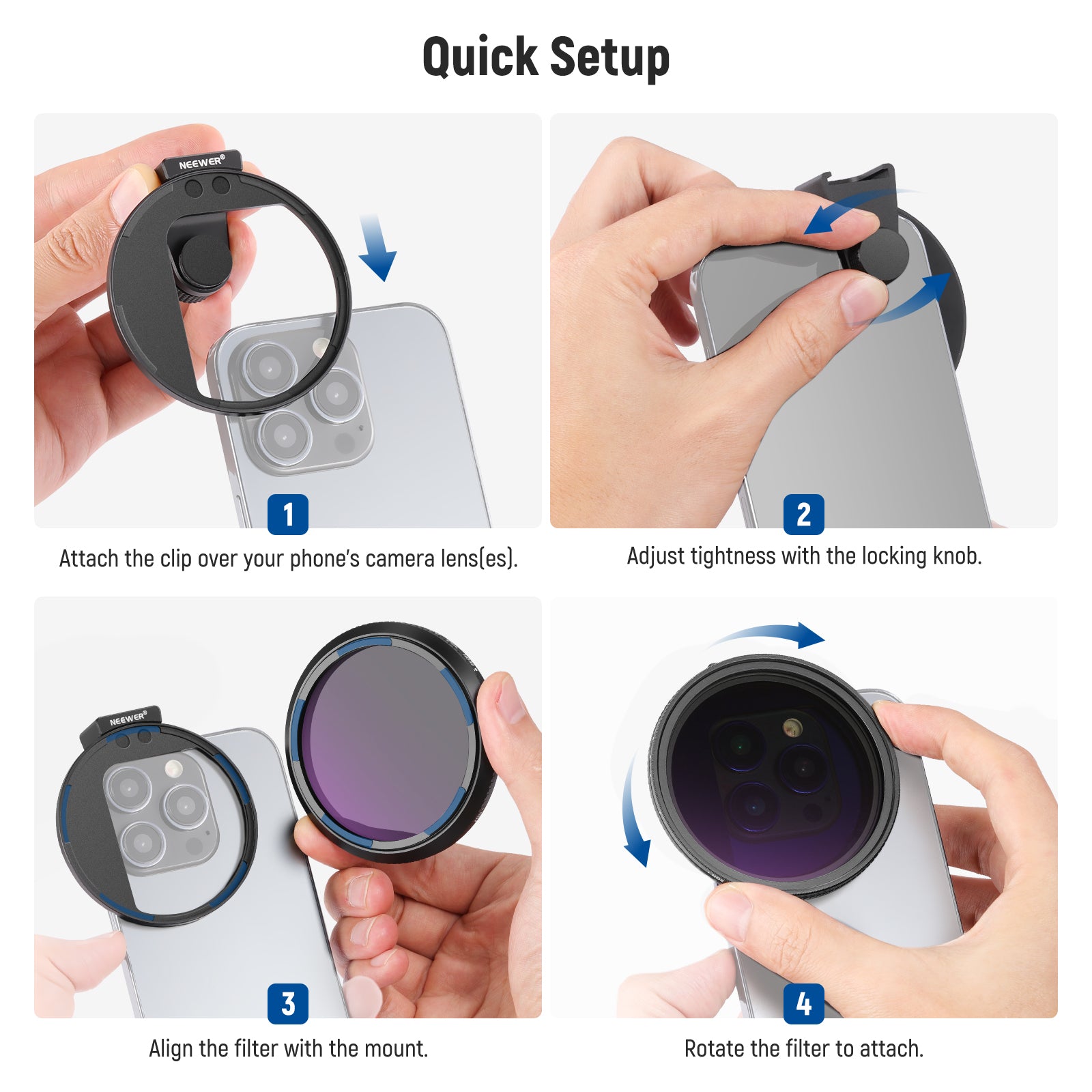 - Versatile Phone Shooting Solution- NEEWER 67mm clip on variable ND filter kit for phone lens is your trusted companion to elevate your mobile photography with a universal threaded filter adapter ring and precise light reduction control. Compatible with iPhone 16 15 14 13 Pro Max Plus Samsung Galaxy S22 S23 S24 Ultra, and more phones up to 13mm thick (case removal recommended). This professional accessory kit can be easily stored and transported in the included carrying pouch