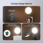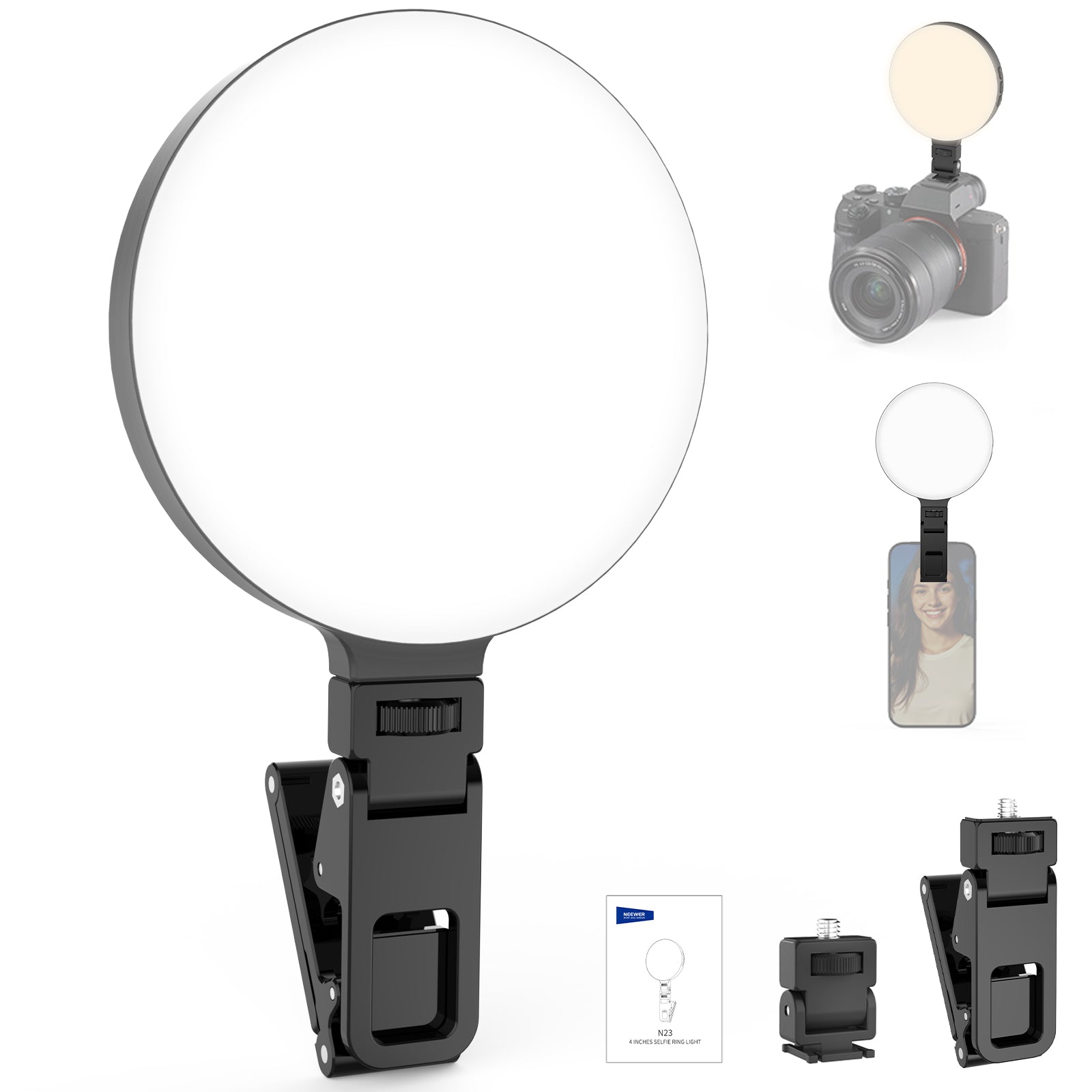 - Versatile- The clip on selfie photo ring light is compatible with iPhone iPad Android Samsung phones as recording and photography lighting accessories. Also a ringlight for desk laptop video conferencing, desktop computer webcam Zoom meetings/calls. Includes a cold shoe mount for camera use