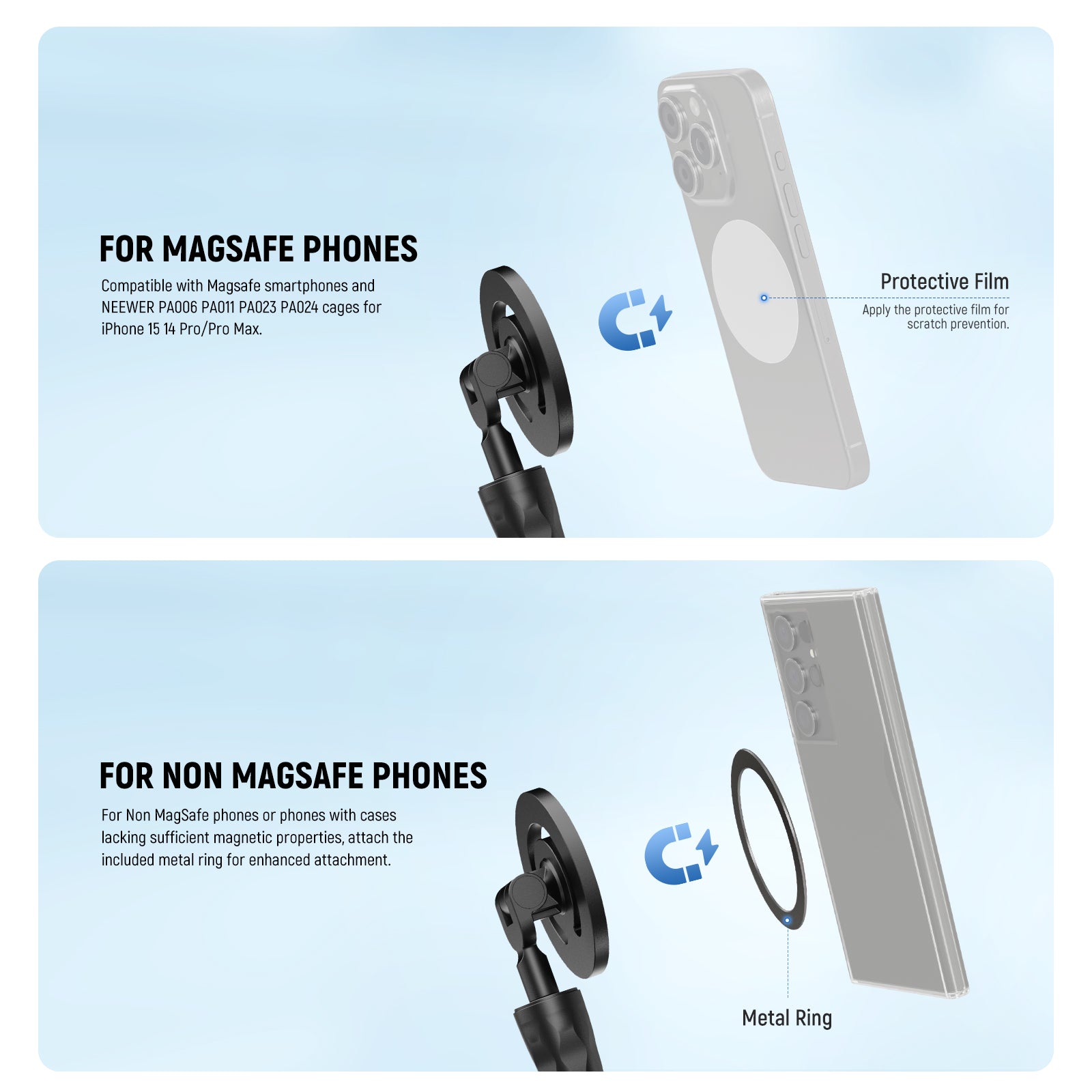 - Universal Magnetic Phone Holder- Constructed of superior magnets, the magnetic phone clamp has powerful and mighty suction, ensuring your device is stable and secure, compatible with MagSafe iPhone 15 Pro Max Plus 14 13 12 series. For non magnetic smartphones, 2 magnetic metal rings are provided to be attached to the cellphone case, allowing the cellphone holder stand to be suitable for almost all smartphones