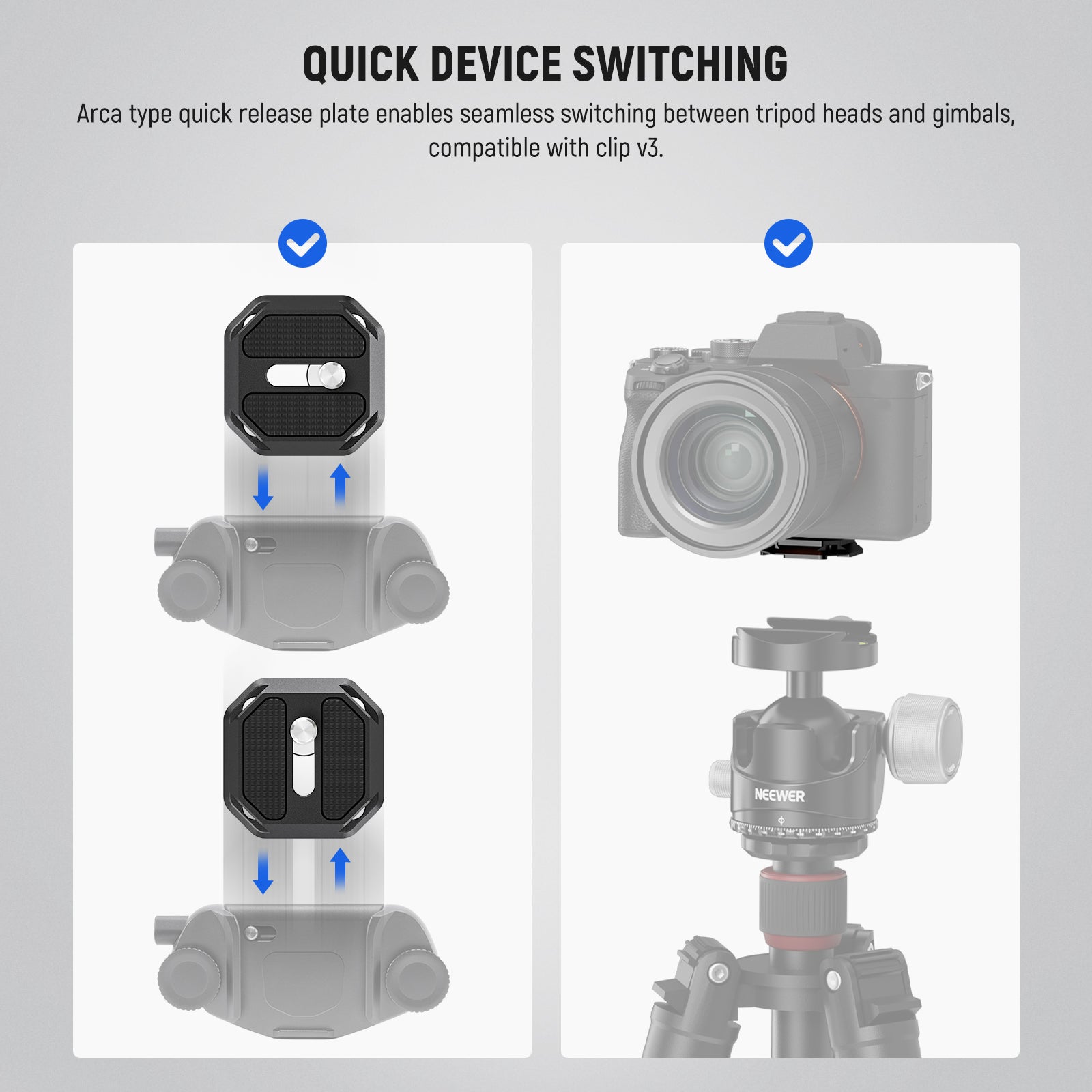 NEEWER quick release plates provide a fast and secure way to attach and detach cameras, camcorders, and other photography gear from tripods, sliders, and gimbals. Designed for stability and precision, these tripod mounting plates keep your equipment firmly in place while allowing effortless setup and adjustments. Made from durable, high-quality materials, our quick release plates deliver long-lasting performance for both studio and on-location shoots. Explore our collection to find the perfect camera mounting plate for your workflow.