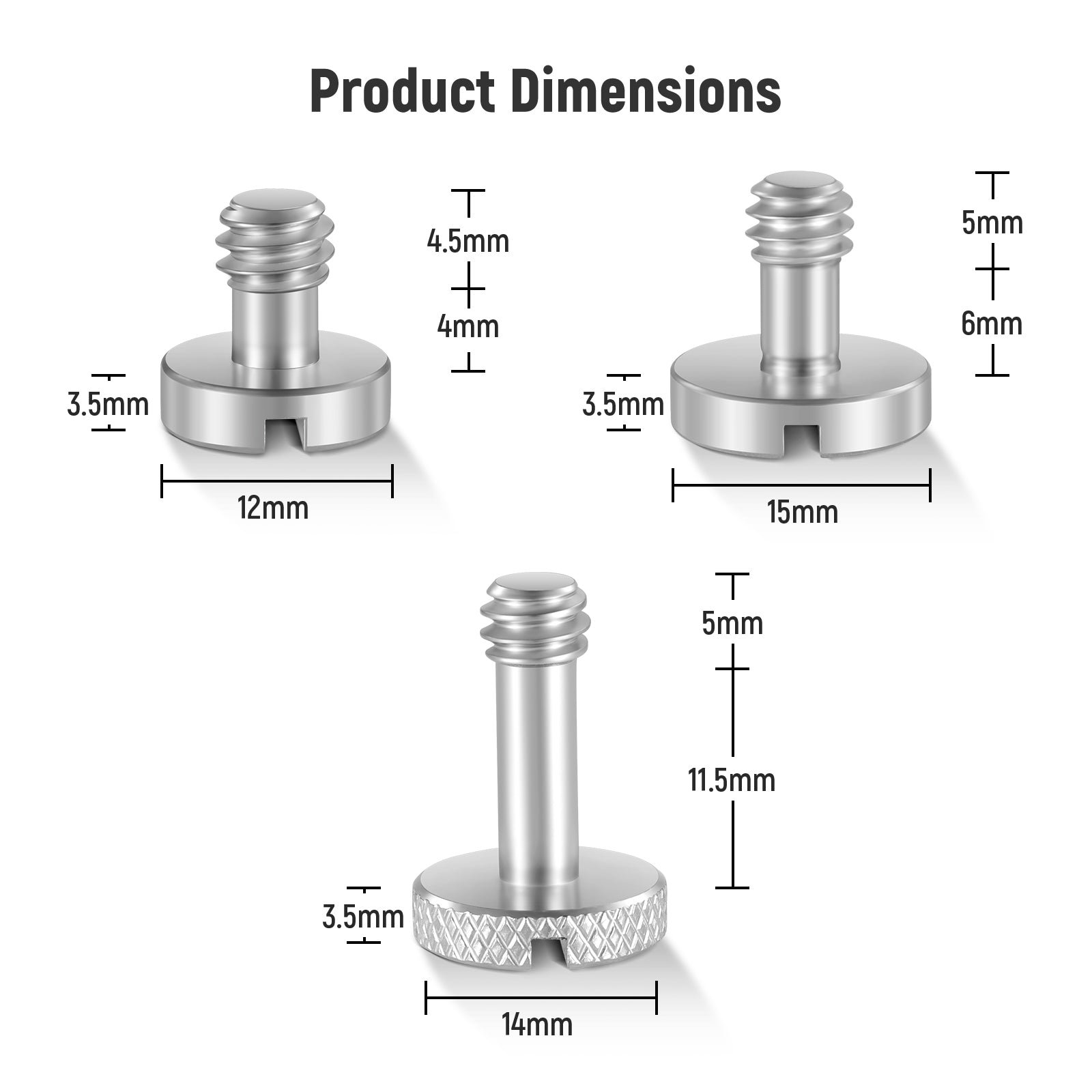 • Quick Release Replacement Screw- Securely mount your camera on the quick-release plate with the 1/4'' slotted screw kit. The 1/4" screws in 3 different sizes with 5 pcs each including 16.5mm (5mm threaded, 11.5mm unthreaded), 11mm (5mm threaded, 6mm unthreaded), and 8.5mm (4.5mm threaded, 5mm unthreaded), for any size and extra quantity for your quick release needs