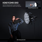 - Honeycomb Grid & Diffusers- The softbox lighting kit includes internal and external diffusers, which can be combined for an even softer and more diffused light. The honeycomb grid directs light at 45° and reduces spill, providing a distinctive soft yet punchy lighting effect that defines the model's facial structure