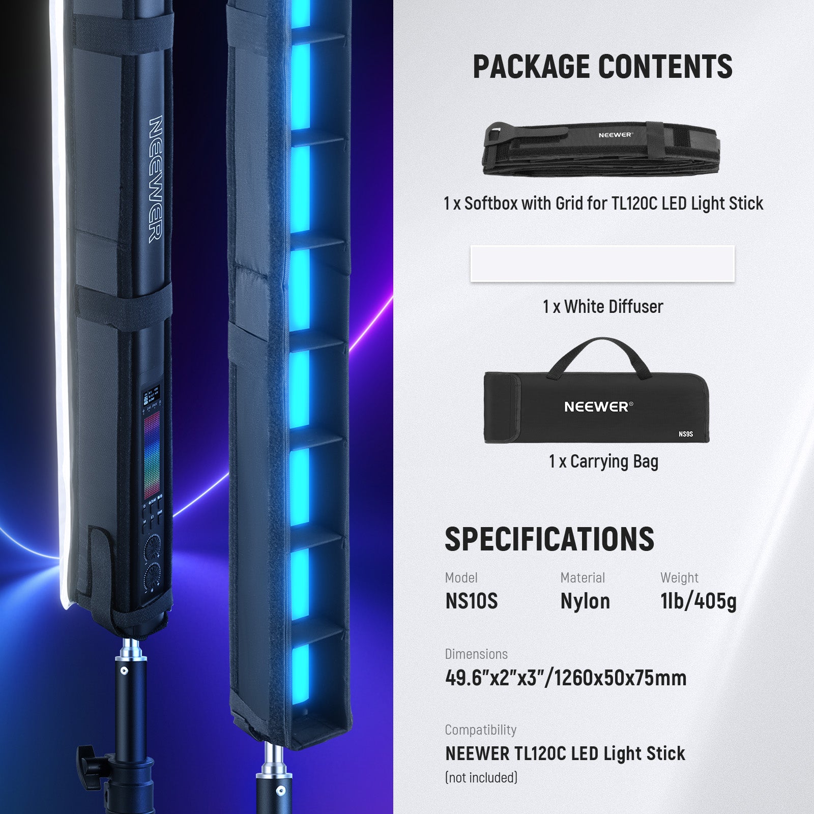 - For TL120C RGB LED Tube Light- Includes the 49.6" x 2" x 3" / 1260 x 50 x 75mm softbox, the integrated honeycomb beehive grid, and a separate white diffuser, exclusively compatible with NEEWER TL120C RGB LED video light stick