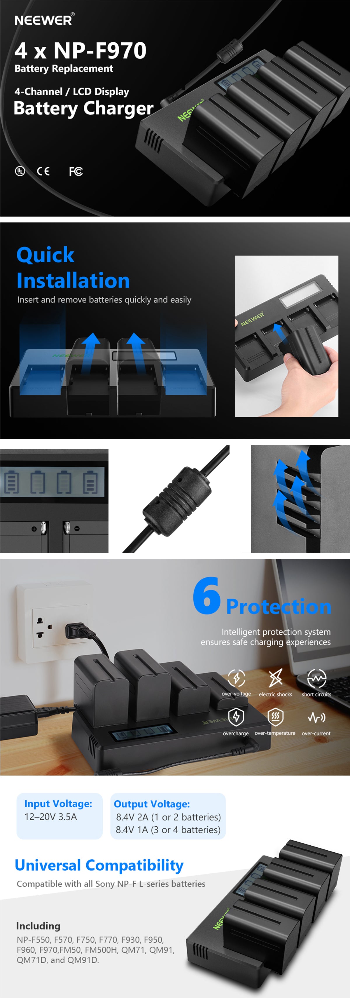 - The charger can charge all NP-F L-series batteries, including NP-F550, 570, 750, 770, 960, 970, and 975. Four NP-F970 batteries are compatible with cameras, video cameras, LED lights, and field monitors with the NP-F battery plates.