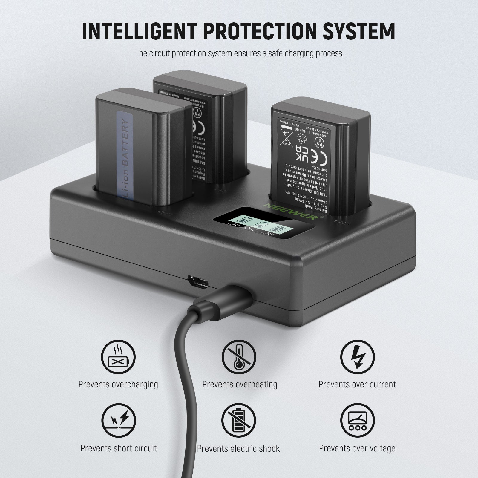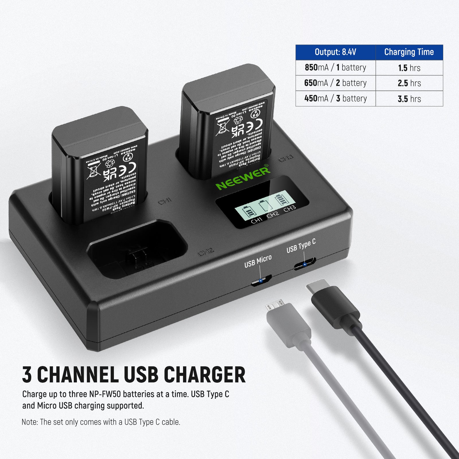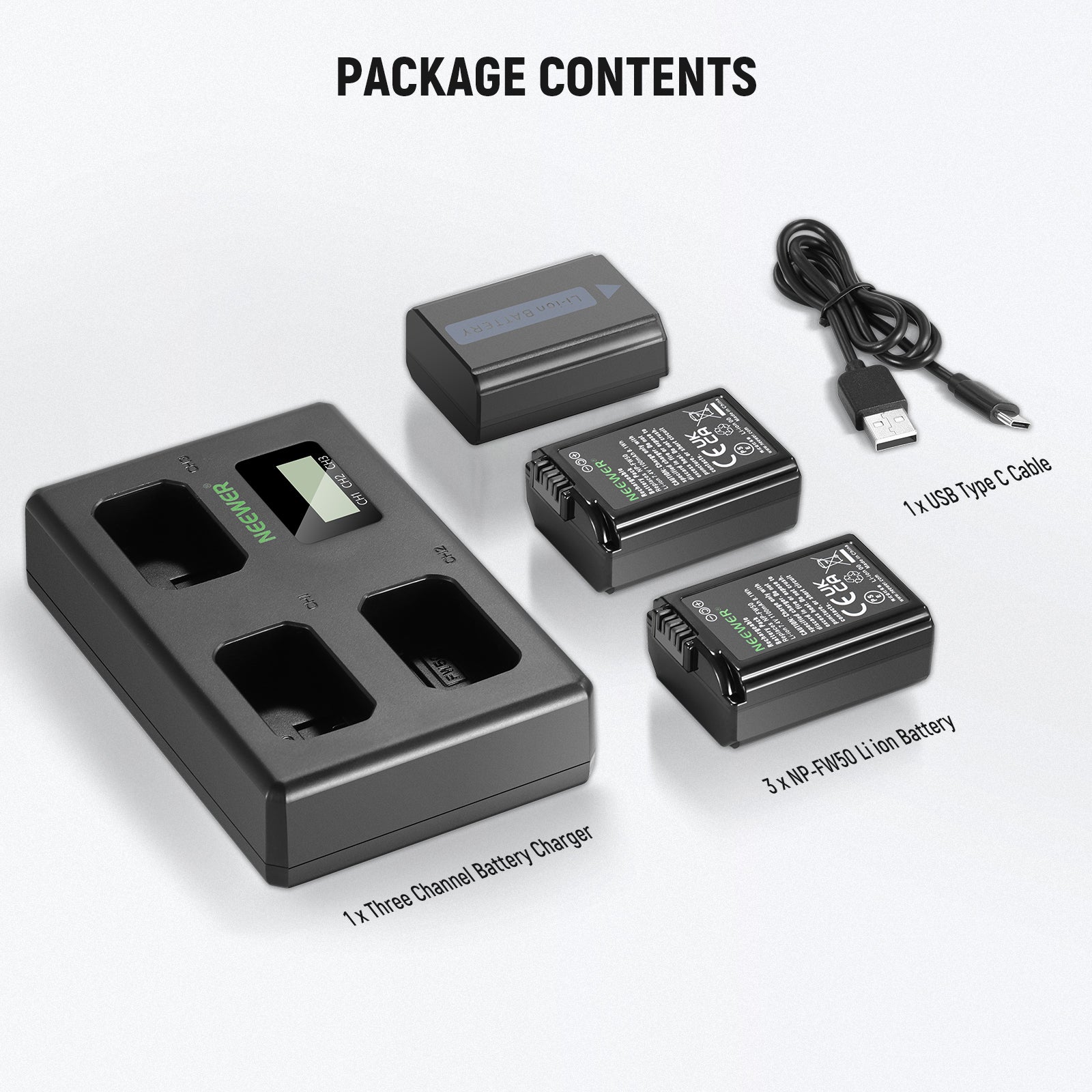 NEEWER 3 Pack Replacement Battery and Charger Set for Sony NP-FW50