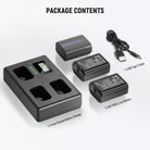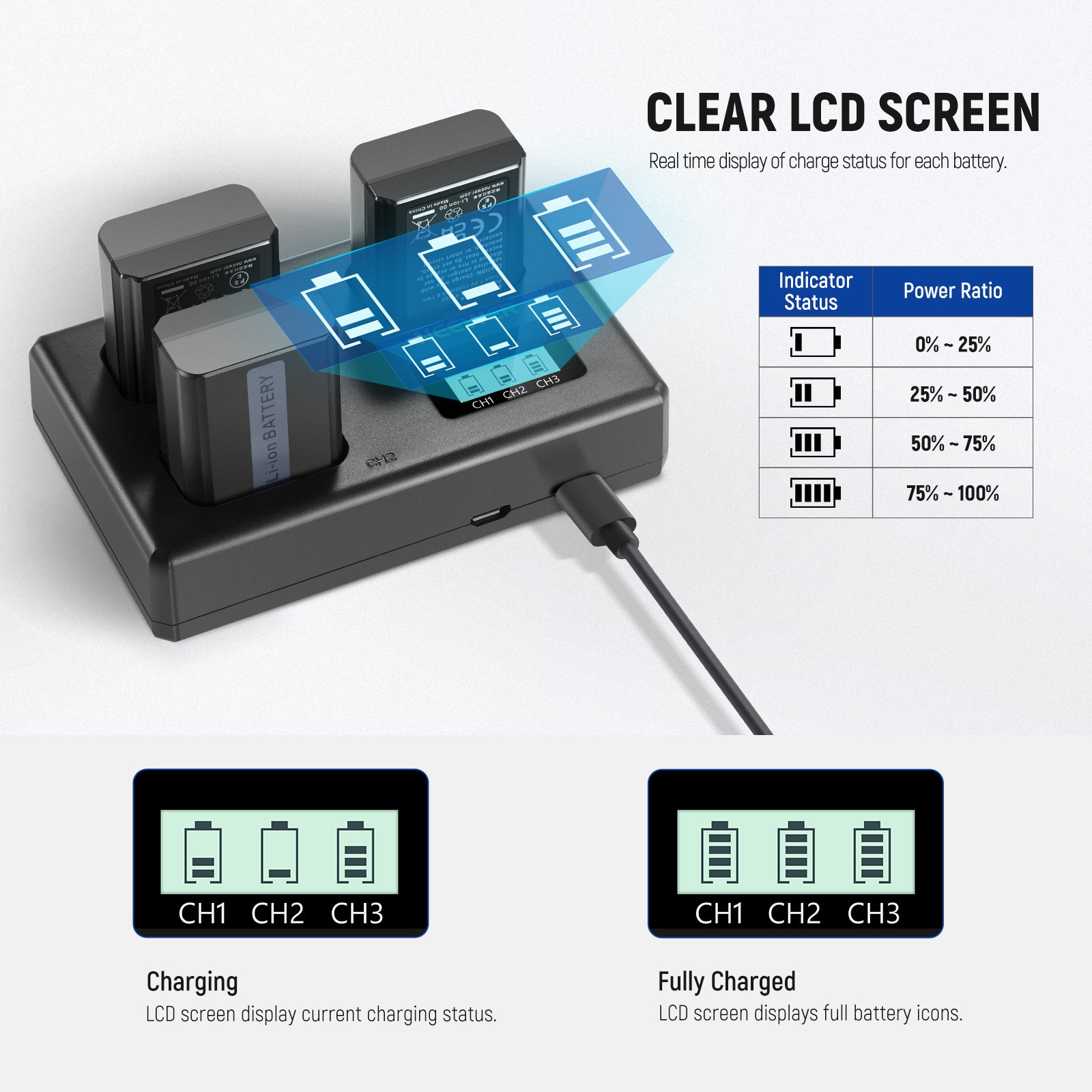 - Triple Slot USB Charger- This triple USB charger allows you to simultaneously charge 3 batteries at home, at the office, or on the go. A backlit LCD screen makes you understand the current charging status of each battery, even in the darkness