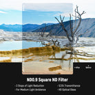 • Flexible Light Control- ND0.9 is for medium light ambience with 3 stops of light reduction and 12.5% light transmission; ND1.8 is for bright ambience with 6 stops of light reduction and 1.56% light transmission. These ND filters reduce the amount of light entering the lens for effective control of shutter speed and aperture, which avoids overexposure and balances the image exposure for the desired depth of field effect or motion blur effect
