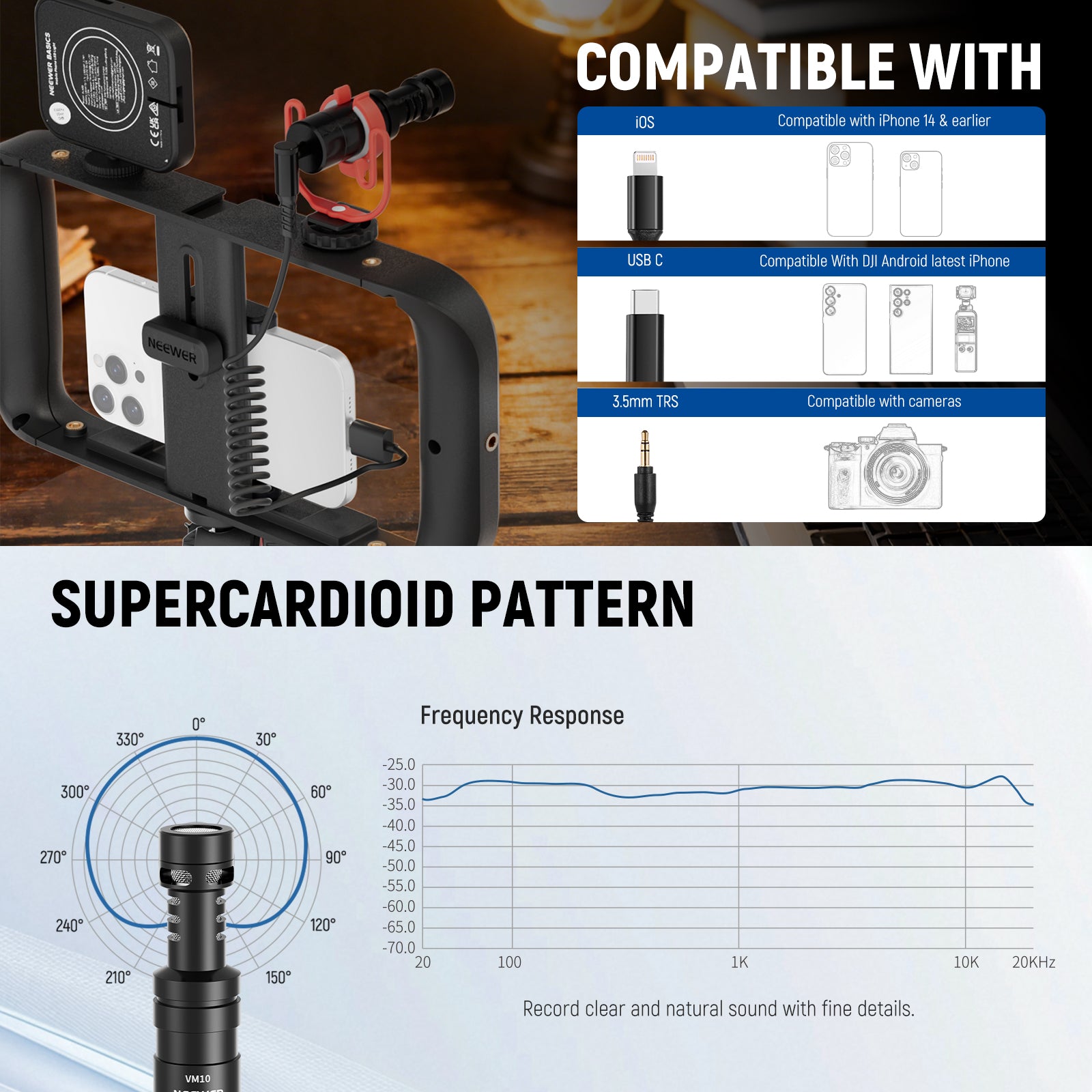 - Small Plug & Play Microphone- Directly plug the mini portable VM10 mic into your device and record professional sound—no batteries are needed. It features a supercardioid polar pattern for clear audio pickup within 1.6'-3.3'/50-100cm. The included OTG and 3.5mm TRS cables are compatible with iPhone, iPad, Android smartphones, and cameras for vlogging, video recording, streaming, podcast. The shock mount and windscreens help reduce unwanted noise