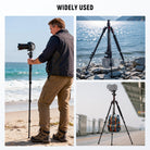 • 2 Axis Flexible Center Column- 1. The unique design of the center column consisting of 2 sections enables the maximum height of the tripod and monopod to be higher; 2. The center axis can be inverted for macro photography, or completely detached for low angle shooting; 3. Combine the center column and the legs as a regular camera tripod, and reverse the legs when stored. Includes a handy hook to hang sandbags (not included) for increased stability