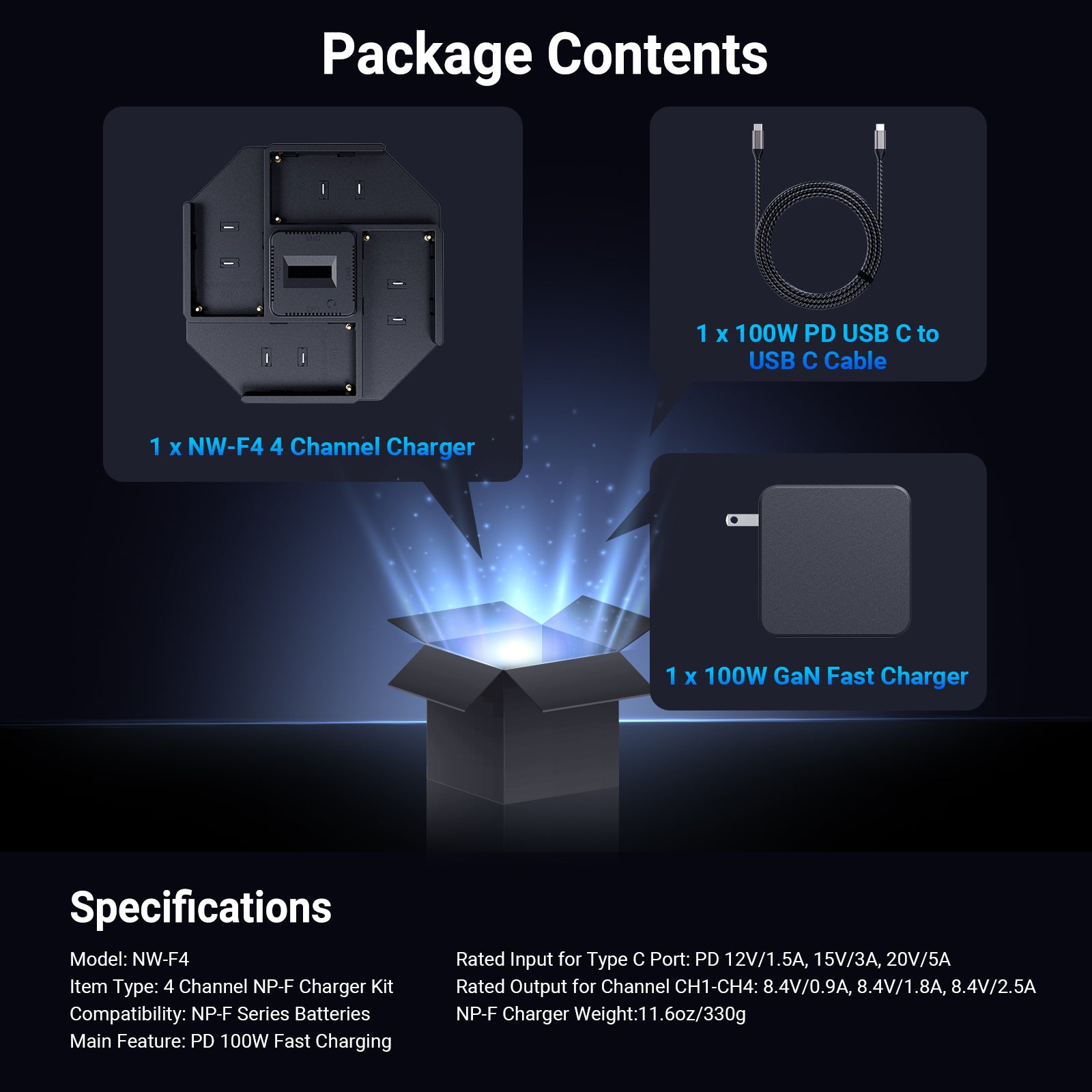 - 100W PD 4 Channel Fast Charging- The NW-F4 efficiently charges up to 4 NPF batteries simultaneously. It supports 100W PD ultra fast charging when used with a 100W PD charger (sold separately), having four 10500mah NP-F970 batteries fully recharged in 4.5H, or four 7800mah NP-F970 batteries in 3H. Note: To achieve full power output, it’s highly recommended to use a 100W PD charger or higher. A 100W PD USB C to USB C fast charging cable is included