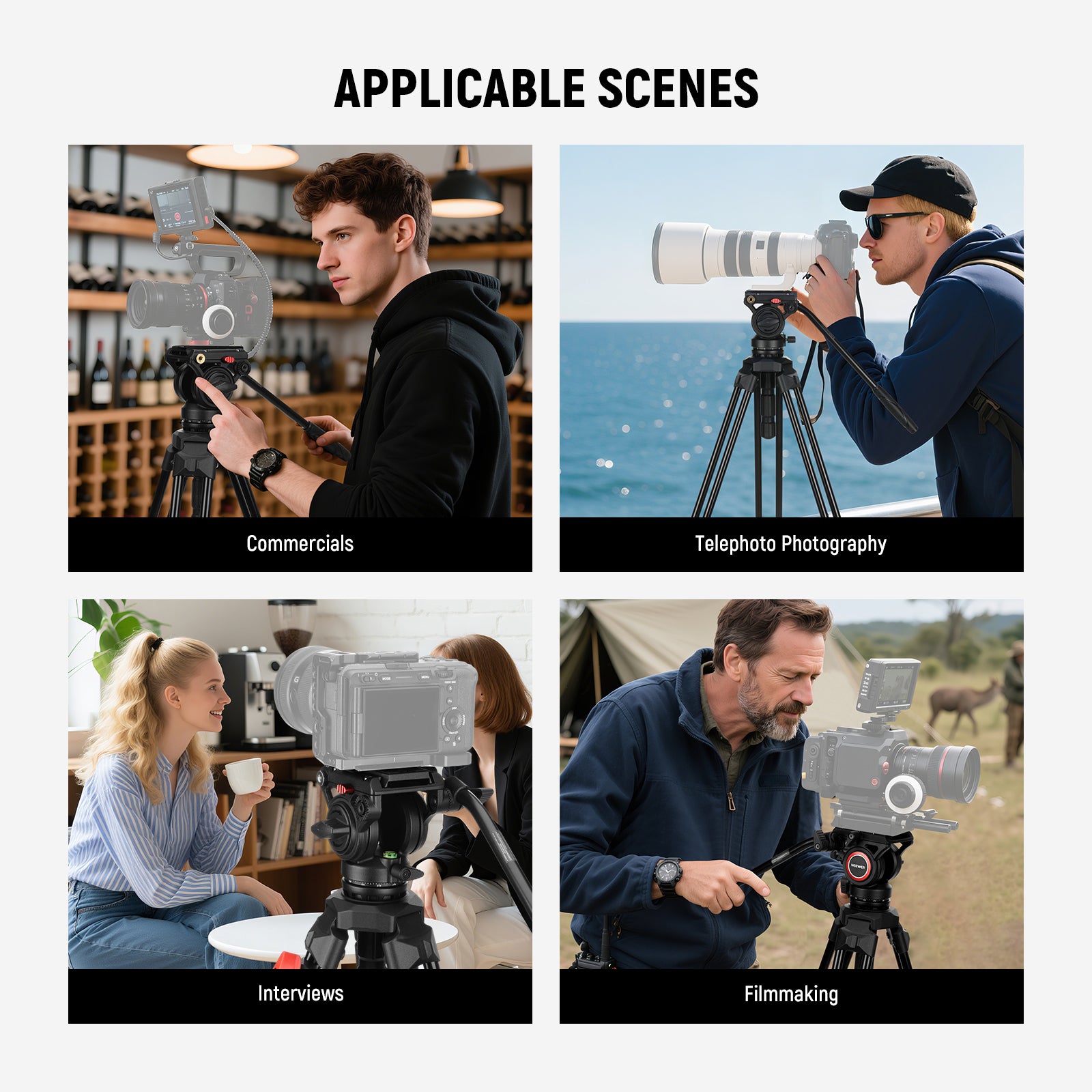 • Universal Mounting Threads- The 1/4" & 3/8" screws on the top of the fluid head make this tall professional vlogging tripod stand compatible with Sony Canon Nikon and other DSLR cameras, mirrorless cameras, camcorders, and telescopes. The extra 1/4" threaded hole on the side is for external photography gear or videography accessories such as magic arms, monitors, cell phone holders, microphones, video lights, etc.