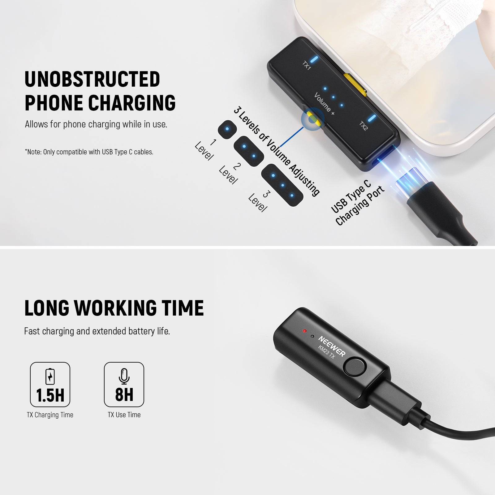 - Stable Transmission & 7H Battery Life- The tiny clip on microphone utilizes 2.4G transmission protocol, supporting stable 131ft/40m signal transmission in open and unobstructed environments. The transmitter can run for 8 hours and it takes 1.5 hours to charge TX fully. You can enjoy convenient phone charging directly through the Type C interface on the receiver