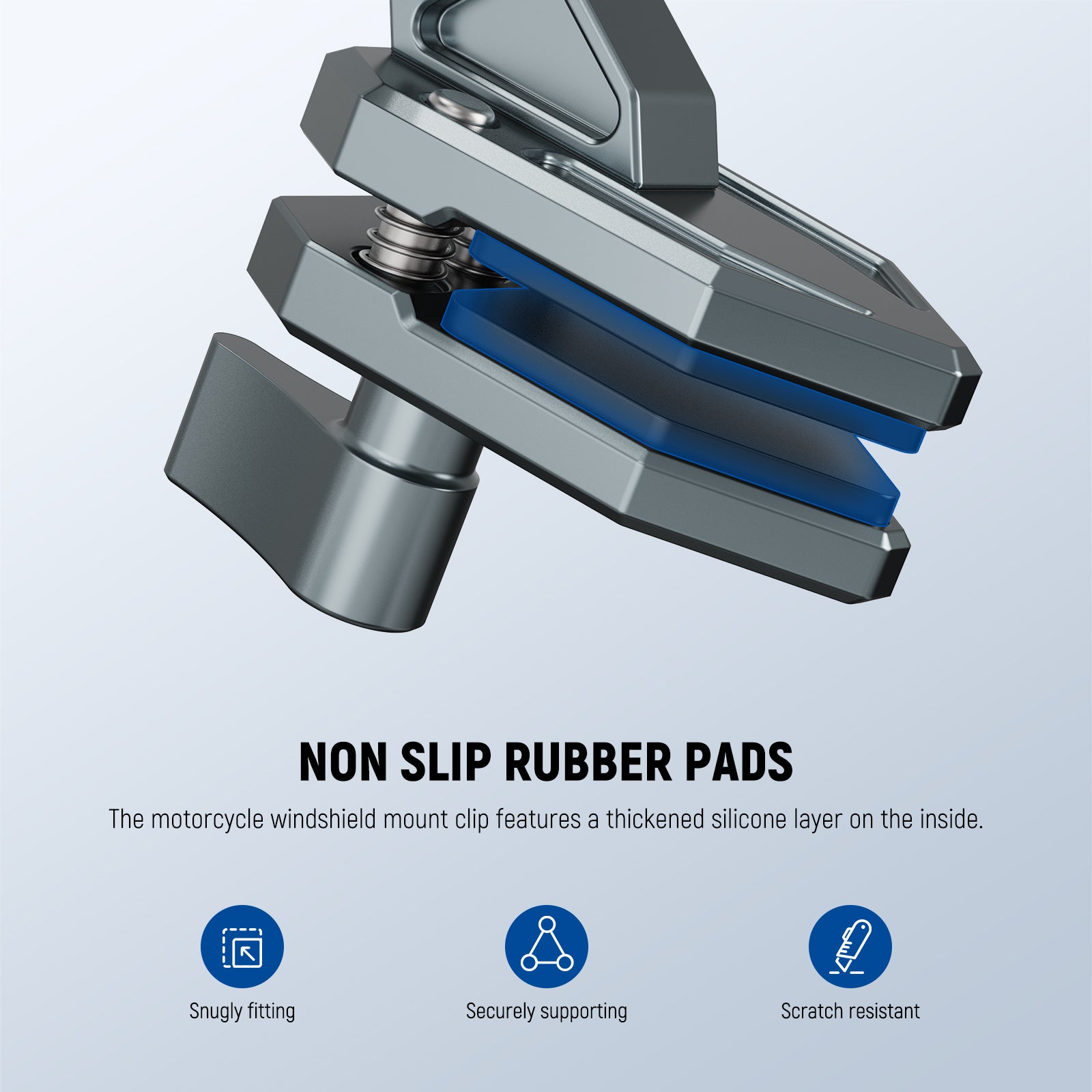 - Non Slip Rubber Pads- The motorcycle windshield mount clip features a thickened silicone layer on the inside, snugly fitting your windshield, securely supporting your device, and preventing the glass from scratches