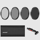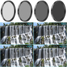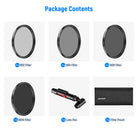 - Neutral Density Filter Set- This kit includes four neutral density filters (ND2/ND4/ND8/ND16), a lens cleaning pen, a cleaning cloth, and a filter pouch. For long exposure photography and a shallow depth of field, these filters can slow down the shutter speed, create dramatic motion blur, and avoid overexposure when using a wide aperture