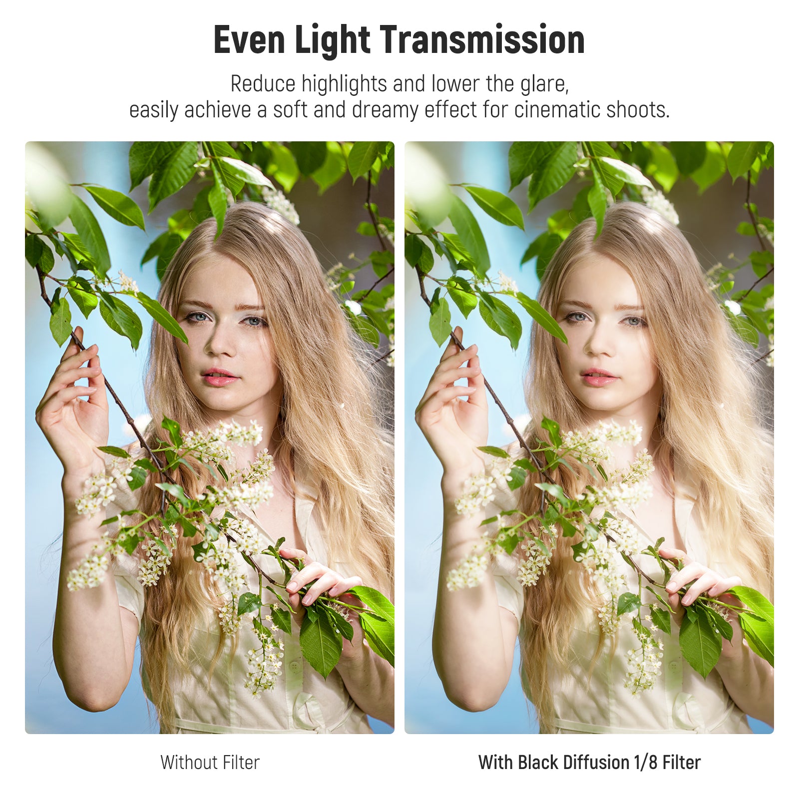 - Black Diffusion Camera Lens Filter- NEEWER black diffusion 1/8 filter with dreamy cinematic effects helps reduce highlights and lower the glare, making the skin look smoother and softer, ideal for portrait photography, video recording, and vlog videos