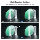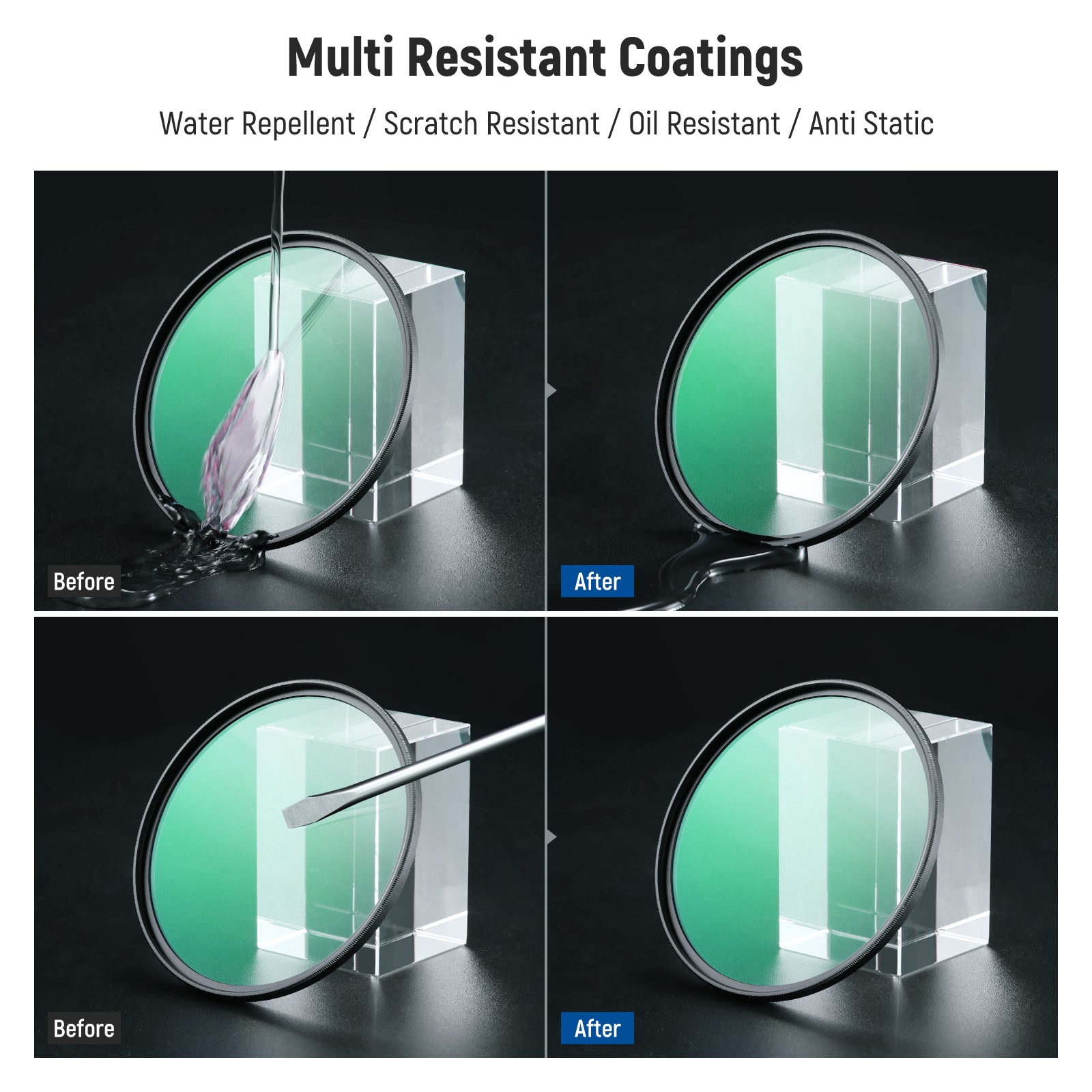 - Multiple Nano Coatings- Multiple nano coatings on both sides are water repellent, scratch resistant, and oleophobic, effectively reducing the reflection came from the filter itself and the ground