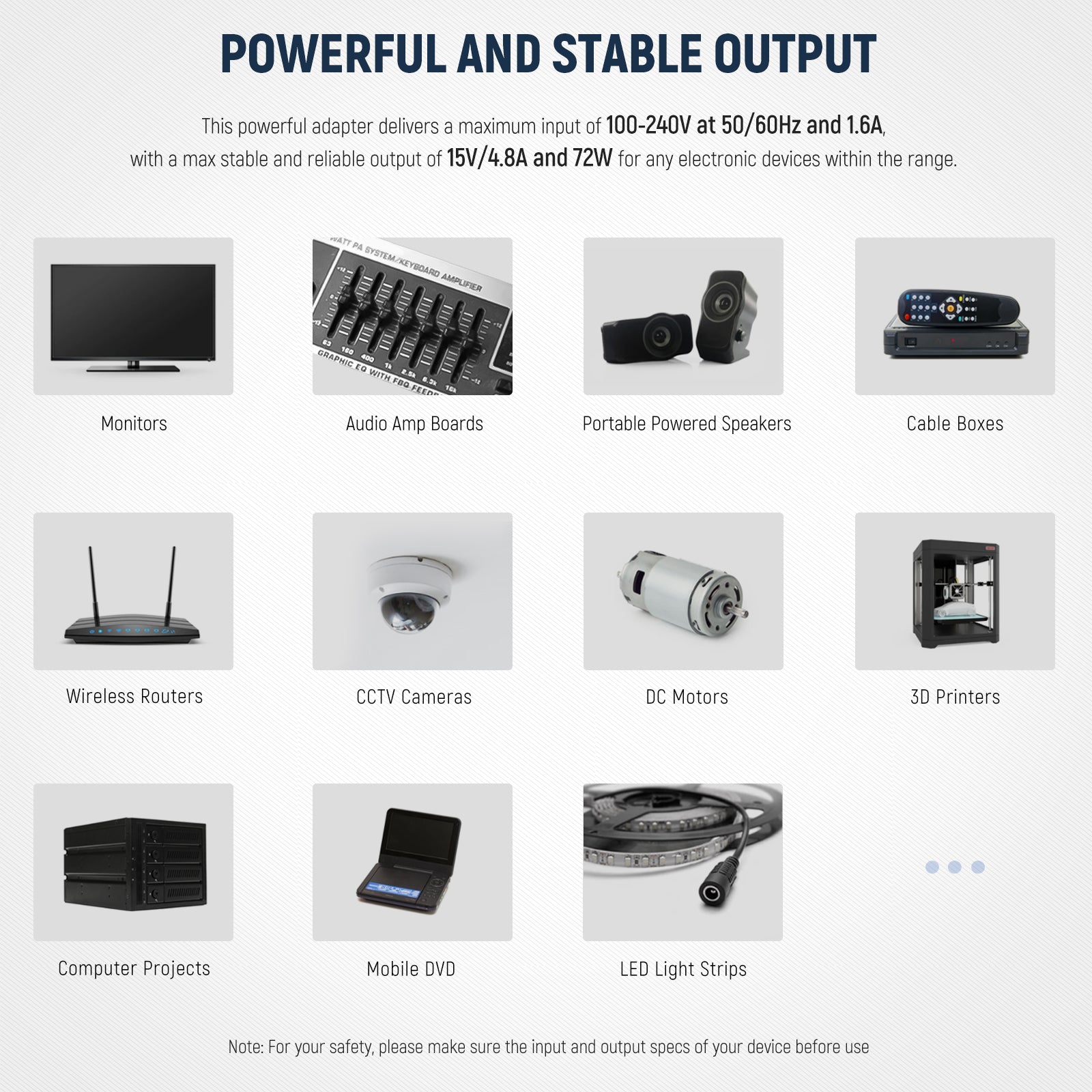 - 15V/4.8A 72W Output- This powerful adapter and cord deliver a maximum input of 100-240V at 50/60Hz and 1.6A, with a max stable and reliable output of 15V/4.8A and 72W for any electronic devices within the range. Note: For your safety, please make sure the input and output specs of your device before use