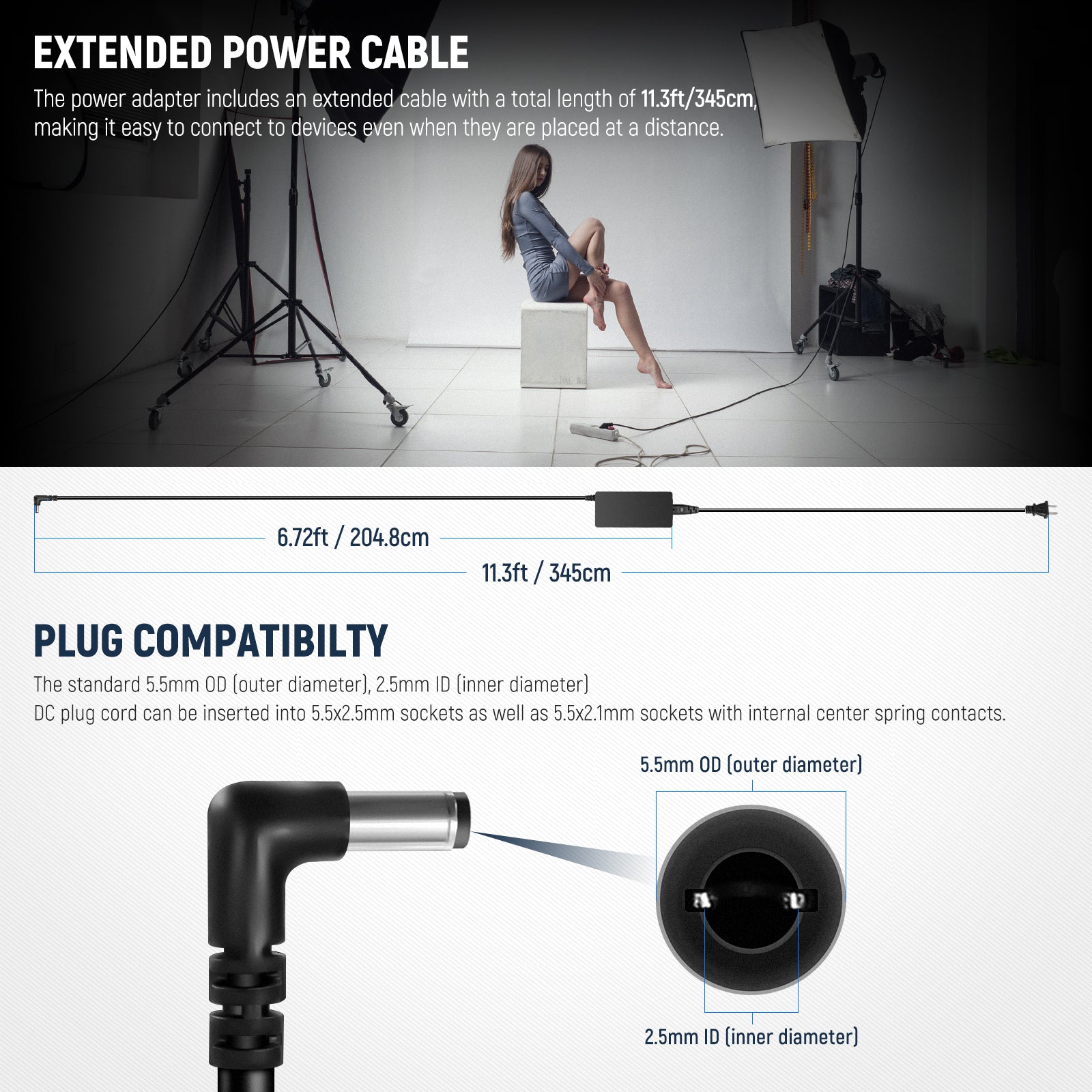 - Extended Cable & Plug Compatibility- The power adapter and cord come with a total cable length of 11.3ft/345cm, making it easy to connect to devices even when they are placed at a distance. Plus, the standard 5.5mm OD (outer diameter), 2.5mm ID (inner diameter) DC plug cord can be inserted into 5.5x2.5mm sockets as well as 5.5x2.1mm sockets with internal center spring contacts