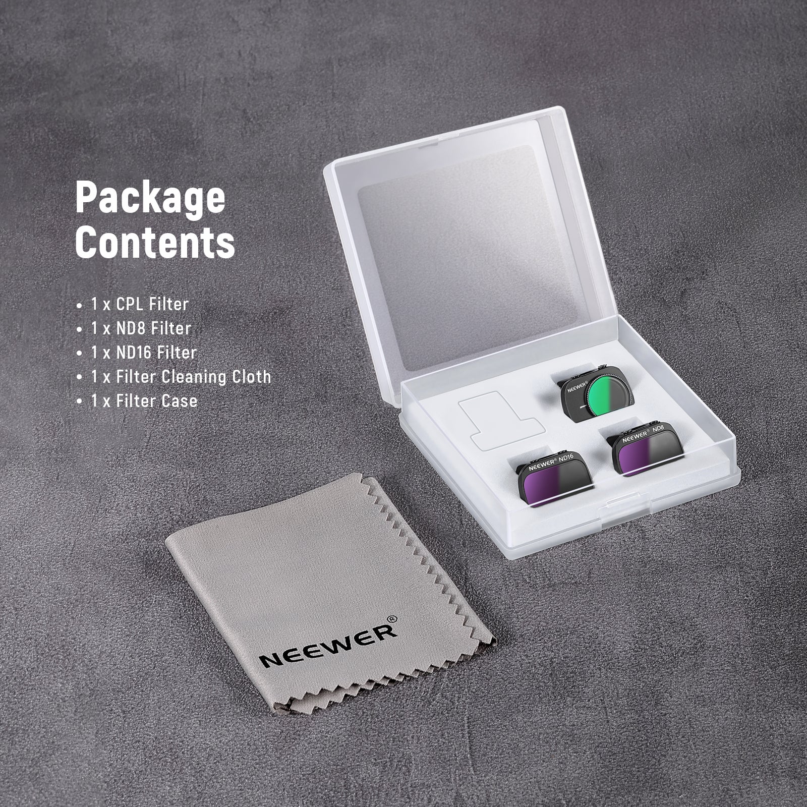 - Compatible with Mavic Mini/Mini 2/Mini SE- NEEWER 3-pack ND8+ND16+CPL Lens filter set is specifically designed for the DJI Mavic Mini/Mavic Mini 2/Mini SE camera. Take this kit with you anywhere go in the convenient storage travel case provided. The package also includes 3x filters and a filter-cleaning cloth