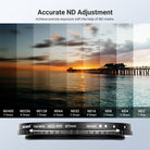 - Flexible Exposure Balance- Variable neutral density filter (ND2-400) can reduce light by 1-9 stops to prevent overexposure in different conditions and create cinematic motion blur effects for photography and video recording