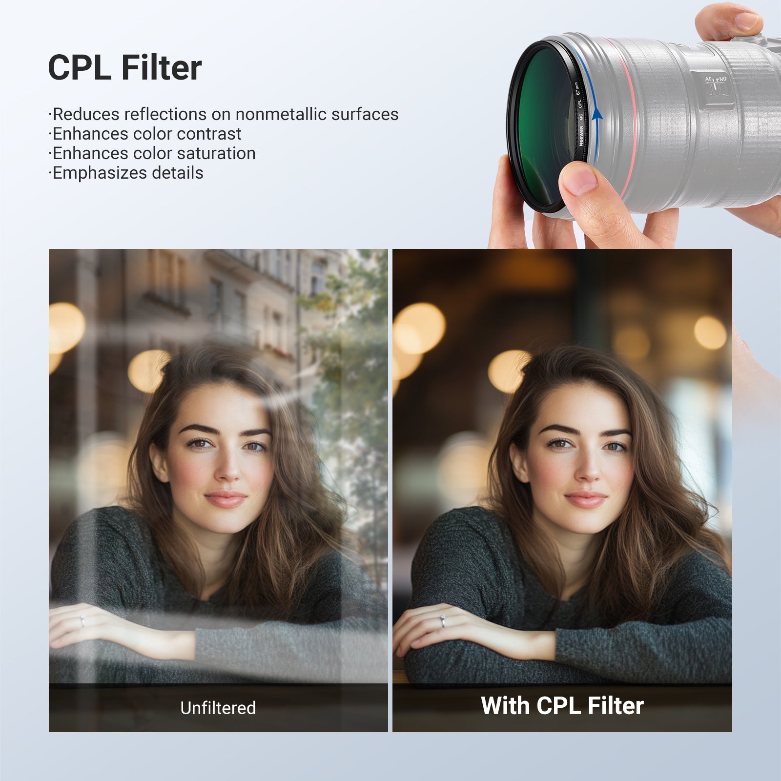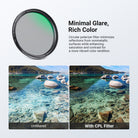 - Minimal Glare, Rich Colors- Circular polarizer filter minimizes reflections from nonmetallic surfaces while enhancing saturation and contrast for a more vibrant color rendition