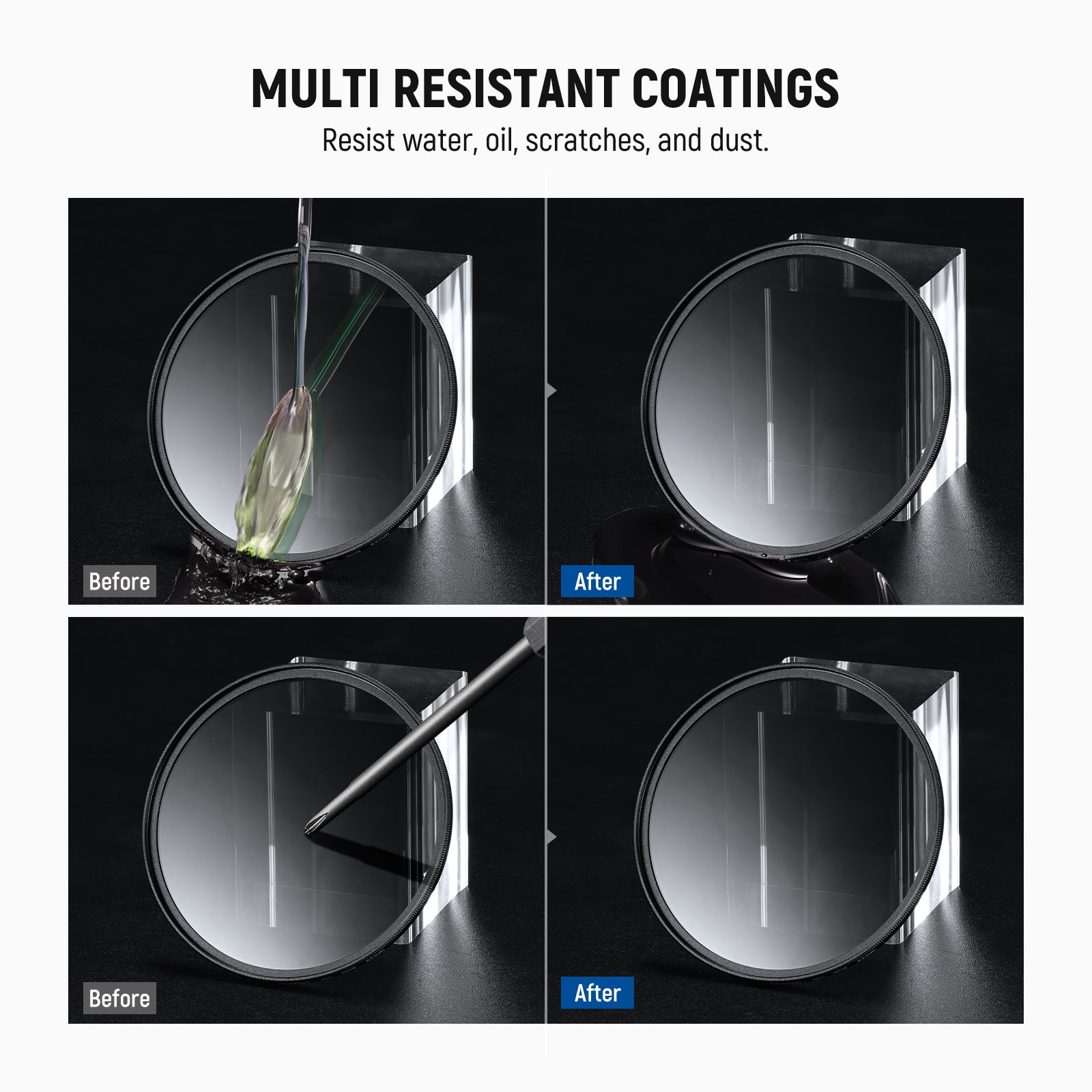 • Multicoated Optical Glass- Multiple protective coatings resist water, scratches, smudges, and fingerprints while minimizing reflection and glare. A cleaning cloth helps keep filters spotless in everyday use