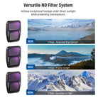 - Balanced Exposure for Landscape- The ND16, ND32, and ND64 drone lens filters provide varying levels of light reduction, ranging from 4 to 6 stops. These filters allow for precise exposure control in different lighting conditions, enabling creative effects like motion blur and shallow depth of field in drone photography and videography