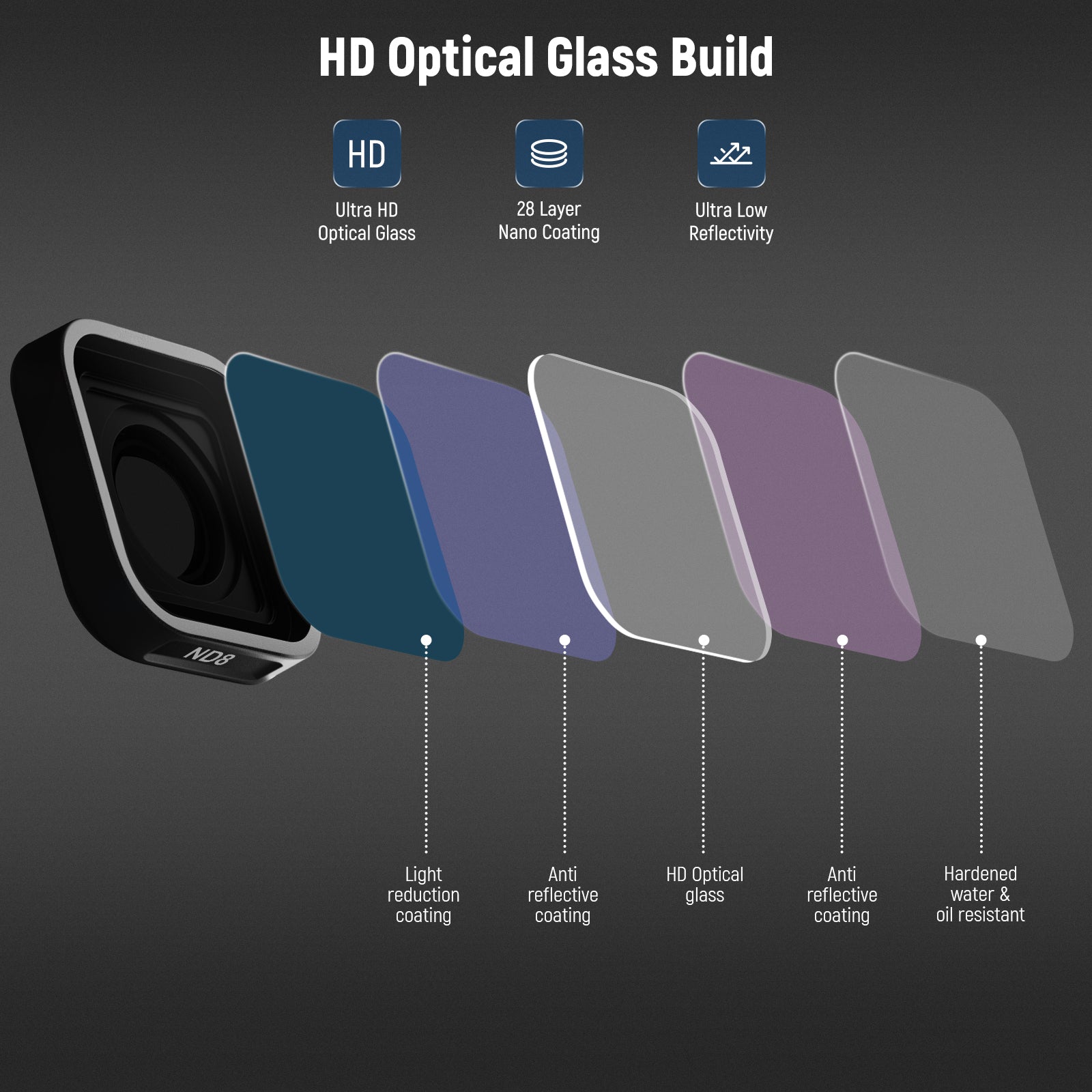 - HD Optical Glass Build- Made of HD optical glass, the action camera lens filters deliver clear video images with no color cast. The lightweight aluminum frame adds barely noticeable weight to your camera
