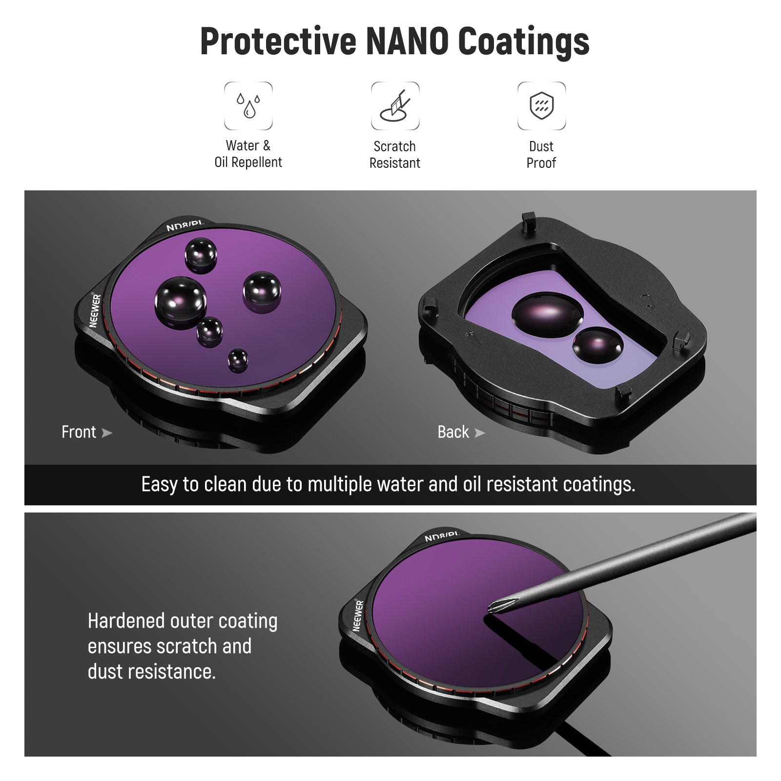 - NANO Coated HD Optical Glass- With 30 layers of multi-functional NANO coatings on both sides of the HD optical glass, these filters are water-repellent, scratch-resistant, and oil proof