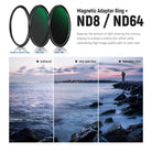 - 1s Swap Magnetic System- Screw the ultra slim and lightweight adapter ring onto the front of the camera lens, and the adapter ring will magnetically attach any one of the three included filters and the lens cap. The NEEWER magnetic system is compatible with K&F Concept's magnetic series filters, such as magnetic CPL/ND8/D64/ND1000/ND2-ND32/ND8-ND128 filters
