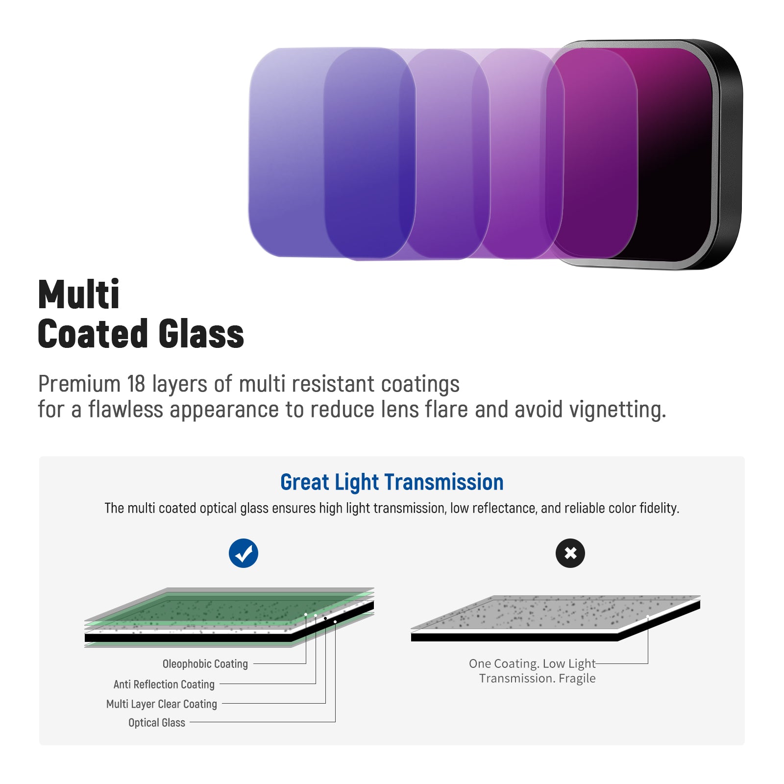 - Reduce Lens Flare- Neutral density filters reduce light to decrease the chance of overexposure. Polarizer filter increases contrast while eliminating reflection and glare. The CPL Filter is at a preset level and can prevent unnecessary glare from reflecting surfaces (such as water, snow and even glass windows) without rotation.