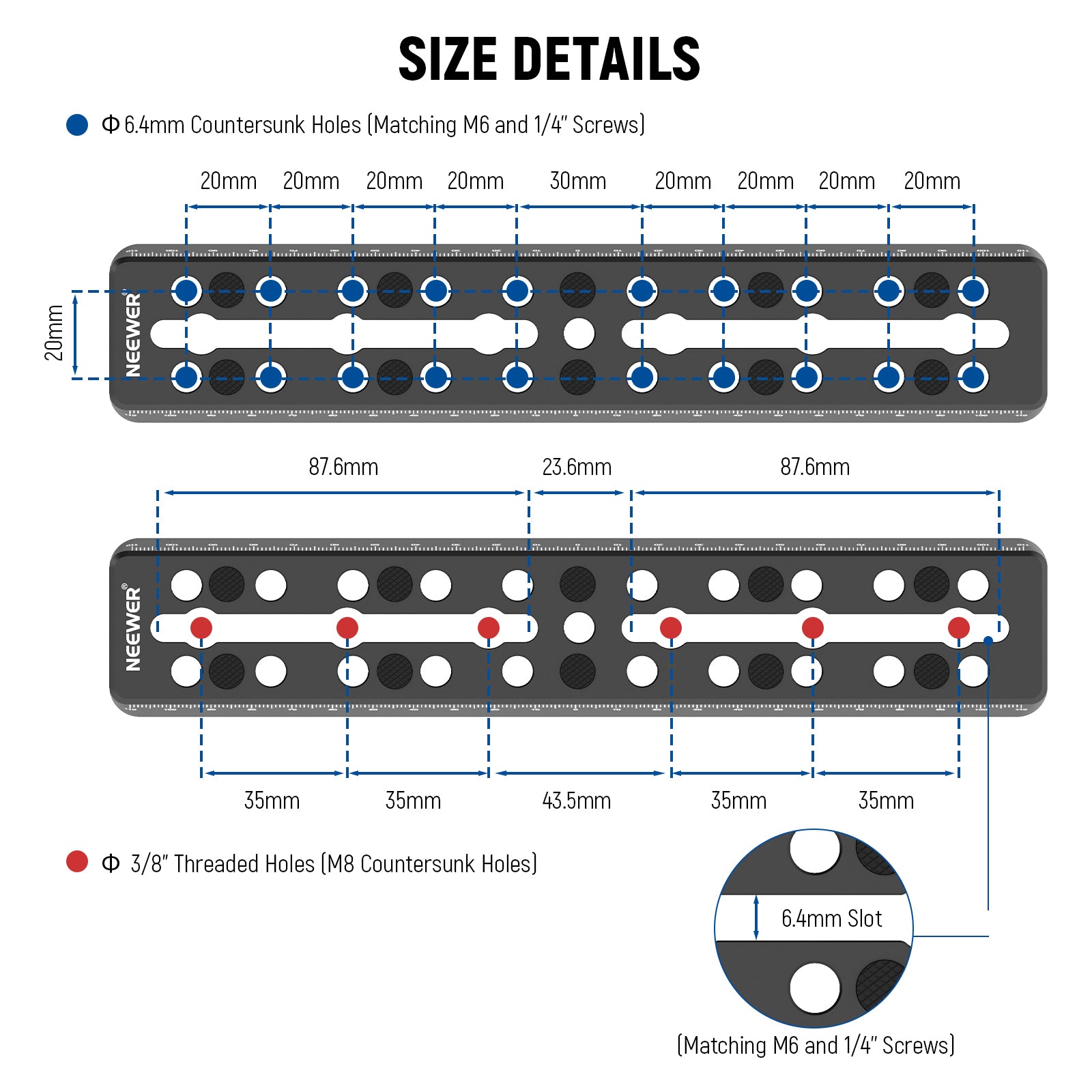 - Twenty 1/4" Screw Holes- Twenty 1/4" screw holes are evenly distributed on both sides of the countersink slots, with a spacing of 0.8" (20mm) between each other. These holes are useful for mounting a variety of devices with the matching thread
