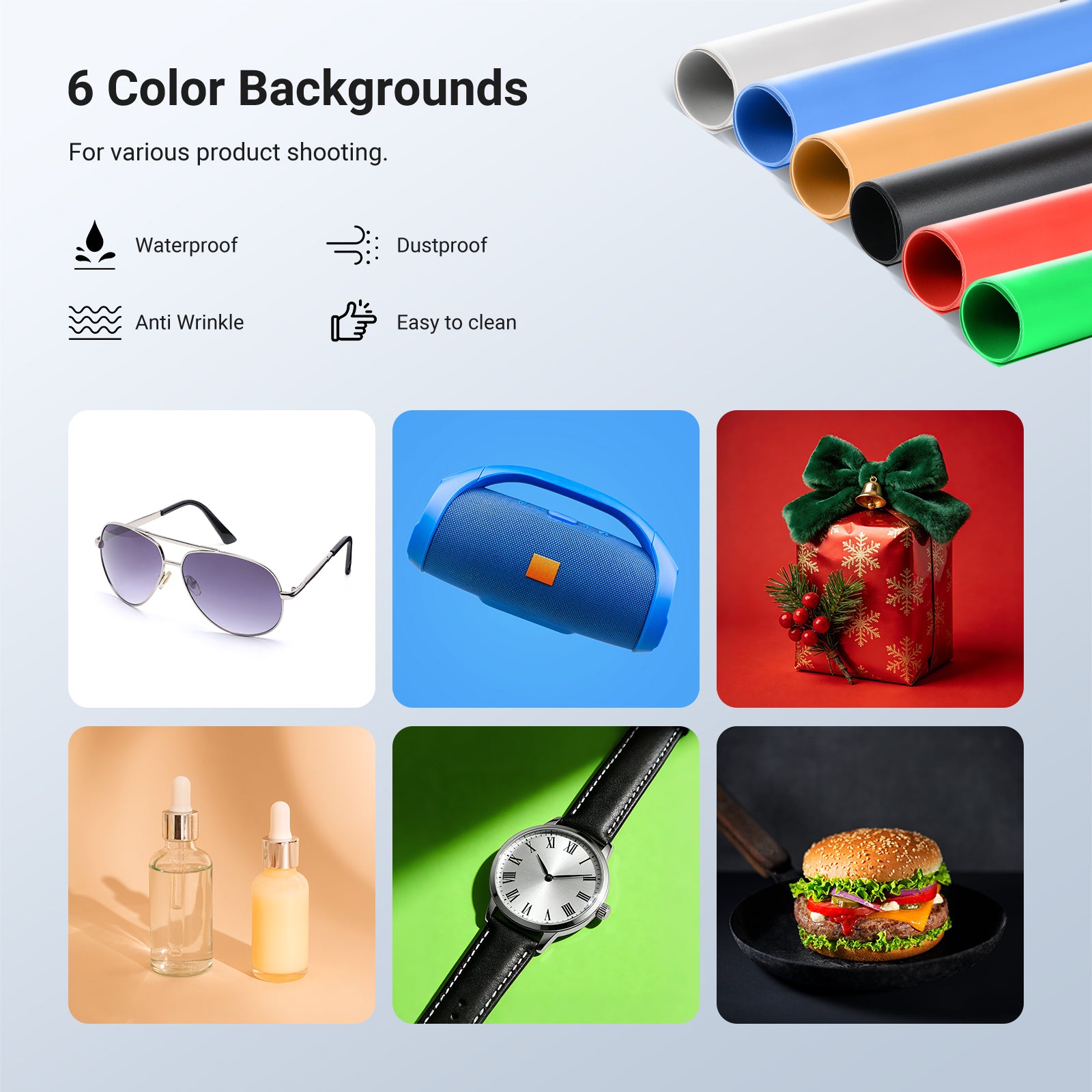 - 6 Colors of Backdrops- The studio photography equipment kit includes 6 backdrops to customize various shooting environments. At 12"x12"x12", the photobox is ideal for shooting food photos, electronics, jewelry, cosmetics, and other small to medium sized items
