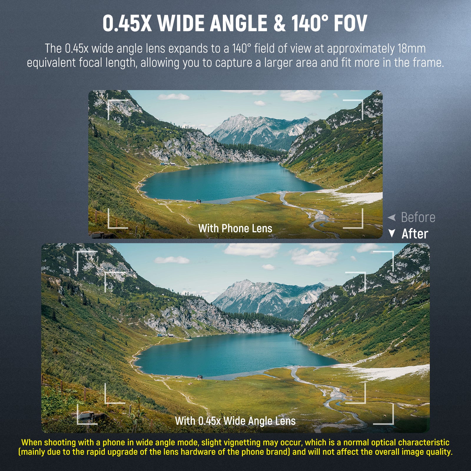 - 0.45x Wide Angle & 140° FOV- The wide angle lens offers a 0.45x magnification with an 18mm equivalent focal length and a 100° field of view. When combined with the macro lens, the field of view expands to 140°. Simply stack two lenses together to broaden, widen, and brighten your perspective—perfect for capturing breathtaking urban and natural landscape