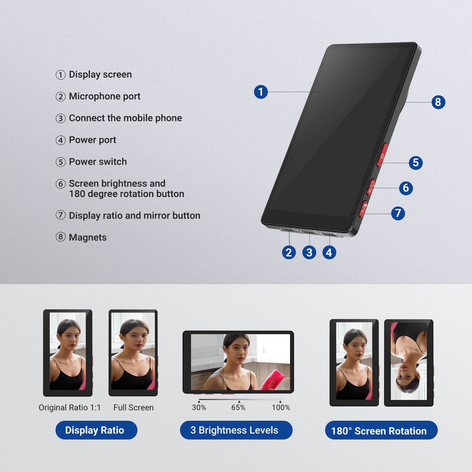 - Simple & Uninterrupted Audio- Connected via the USB C cable for real time phone mirroring, the selfie monitor with up to 600 nits ensures for clear viewing. Preserves all phone audio functions, letting you take calls or play music without interrupting recording. Only 0.2" thick and 2.5oz, the ultra thin all metal build is portable and offers a premium feel
