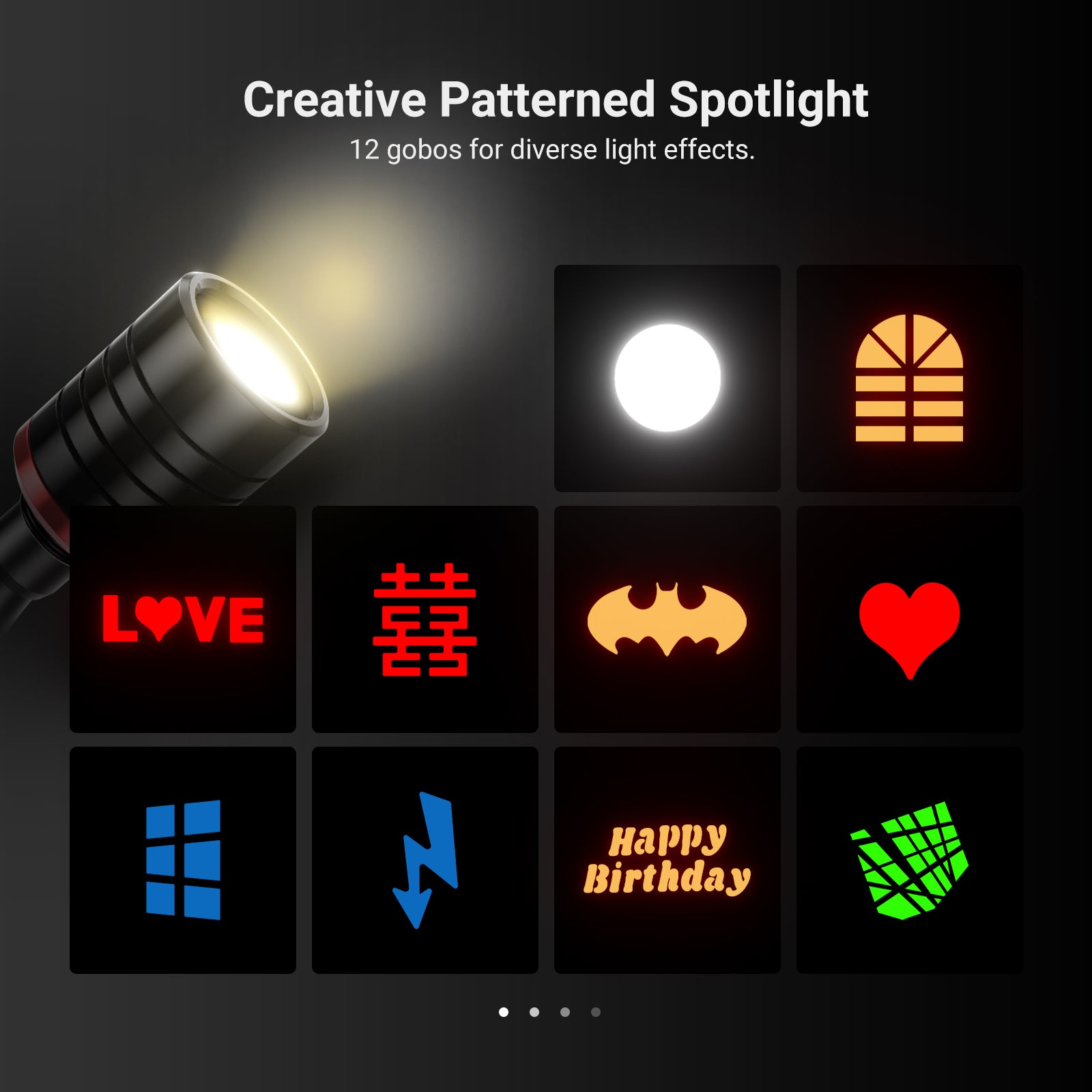 - Creative Patterned Spotlight- Includes a projection lens with 28°-77° adjustable beam angles and 12 gobos for diverse light effects. Other photography accessories like barn door and diffuser modify light shape and enhance close up shots