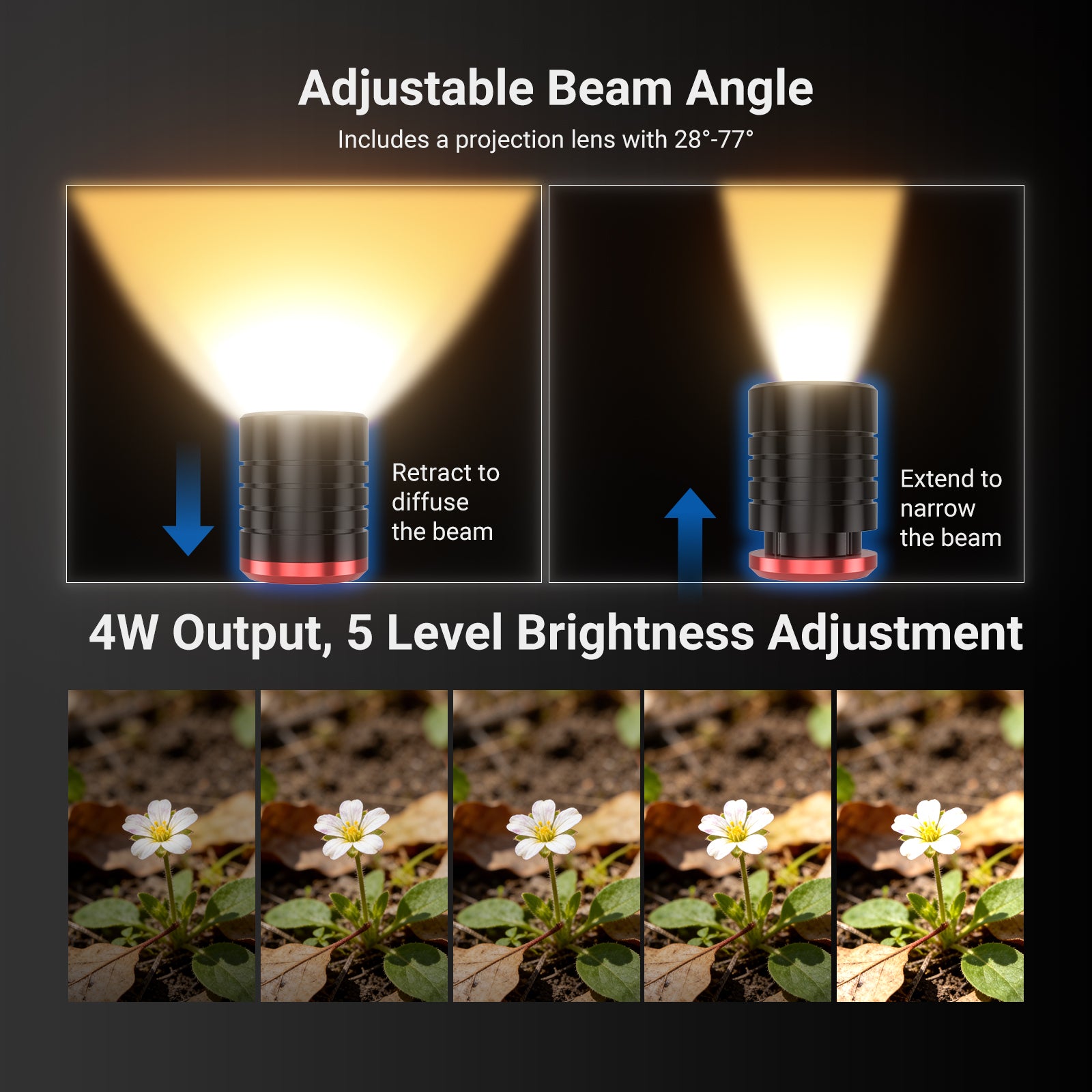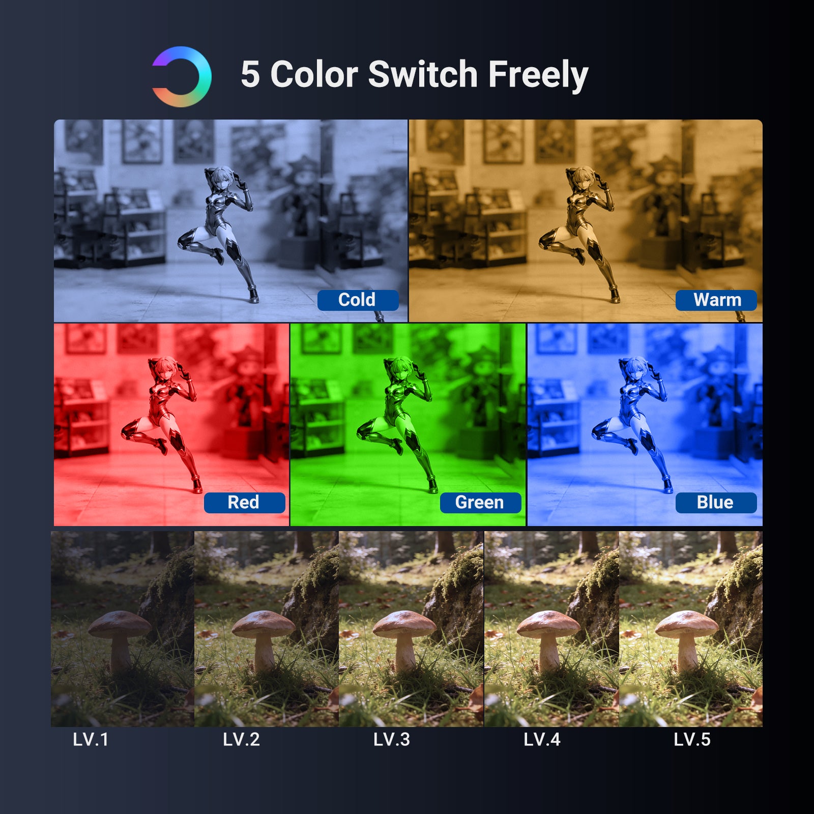 - Macro Photography Lighting- This 4W LED continuous lighting is a content creator essential and influencer must have for macro photography. It features CRI 95, TLCI 94, 1830lux/0.3m max illuminance, 5 colors (red, green, blue, 2700K warm white, 5600K cool white), and 5 brightness levels
