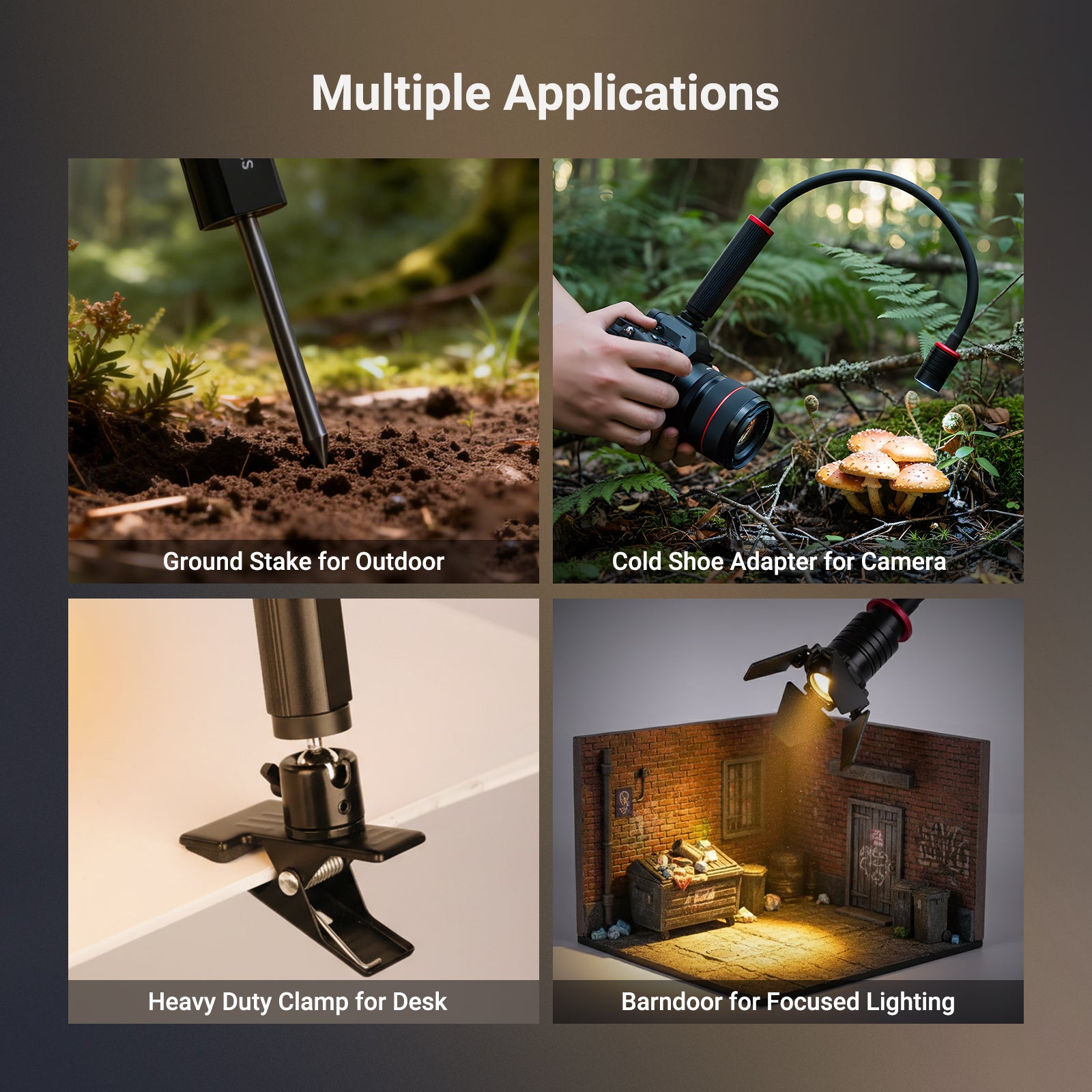 - Versatile Mounting Methods- 38cm flexible yet rugged soft tube supports 360° angle adjustment. It can attach to a camera via the cold shoe adapter or to a desktop via the super clamp. The 1/4" threaded spike can stabilize on any terrain, and IP54 rating allows safe outdoor use