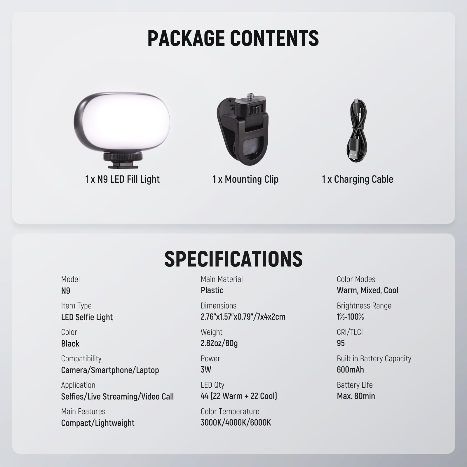 - Ultra Compact & Lightweight- NEEWER N9 mini portable LED light is designed for ultimate portability and convenience, measuring only 2.76"x1.57"x0.79"/7x4x2cm and weighing just 2.82oz (80g, including accessories). You'll barely notice its weight when attaching it to your camera or smartphone for pleasant fill lighting for selfie photos, makeup, desk laptop video conferencing, computer Zoom calls, videography podcast, photography, YouTube TikTok social media vlogging, or during live streaming