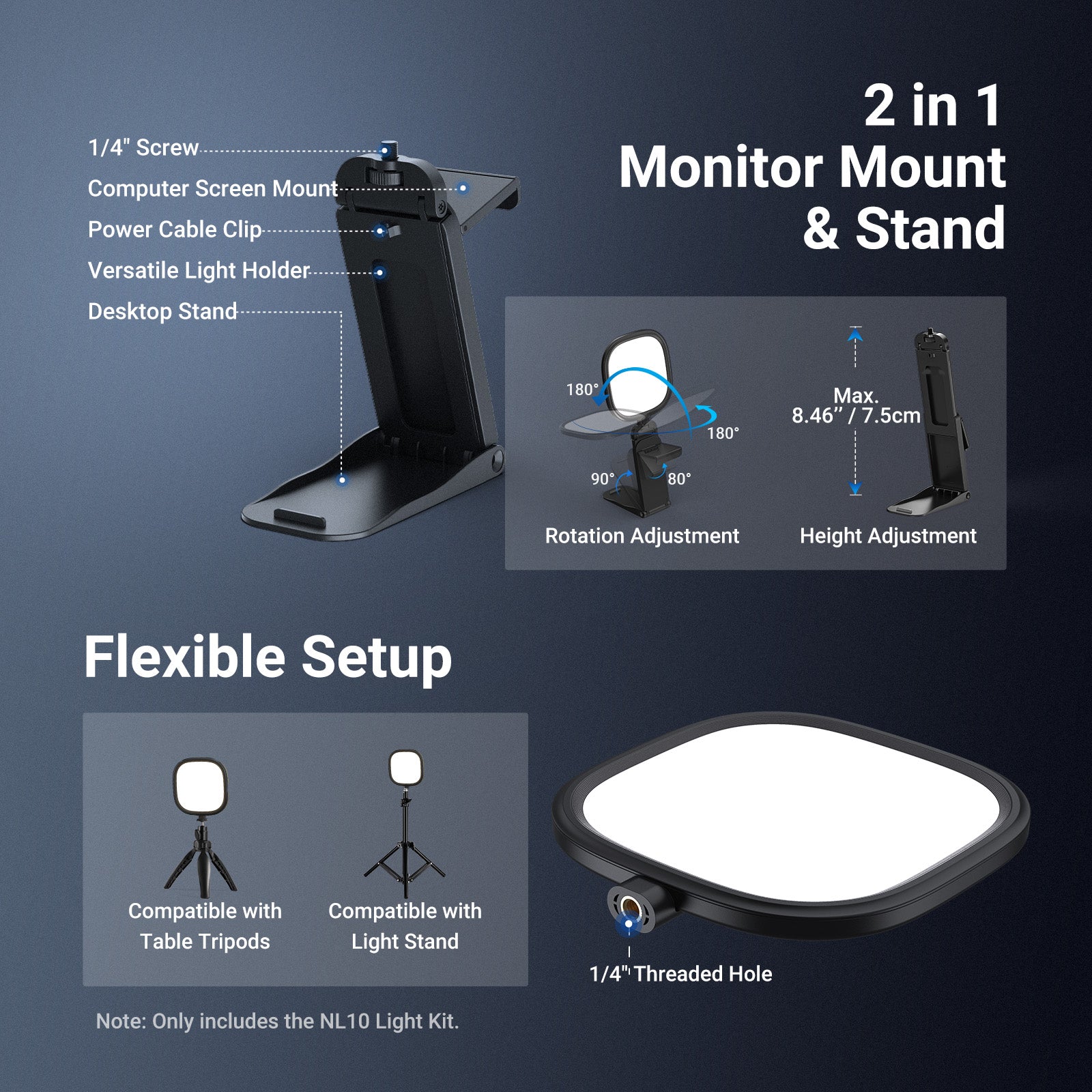 • Multifunctional Light Stand & Adjustable Height/Angle- The detachable stand with a 1/4" screw attaches the webcam light to the top of a monitor, with 4 adjustable height levels. Doubles as a mini desktop stand to hold both the light and a smartphone for phone camera photography/videography as social media content creator essential photo film prop, streamer influencer must have gear. The light head tilts 180° front to back and rotates 360° horizontally from left to right for flexible lighting