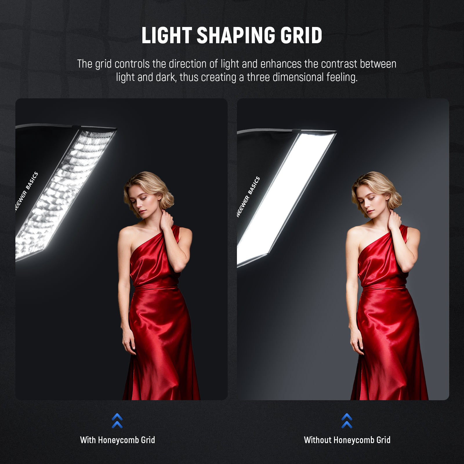 - Customizable Honeycomb Grid & Diffusers- For various shooting scenarios and photography styles - be it portrait, still life, photo, film, live streams, studio camera photoshoot, video recording, filming or streaming, the NEEWER softbox lighting kit includes a honeycomb grid for more confined and directional light, and two diffusion panels attaching via touch fasteners to soften glare and eliminate shadows. Essential soft box set as content creator accessories and influencer must have equipment
