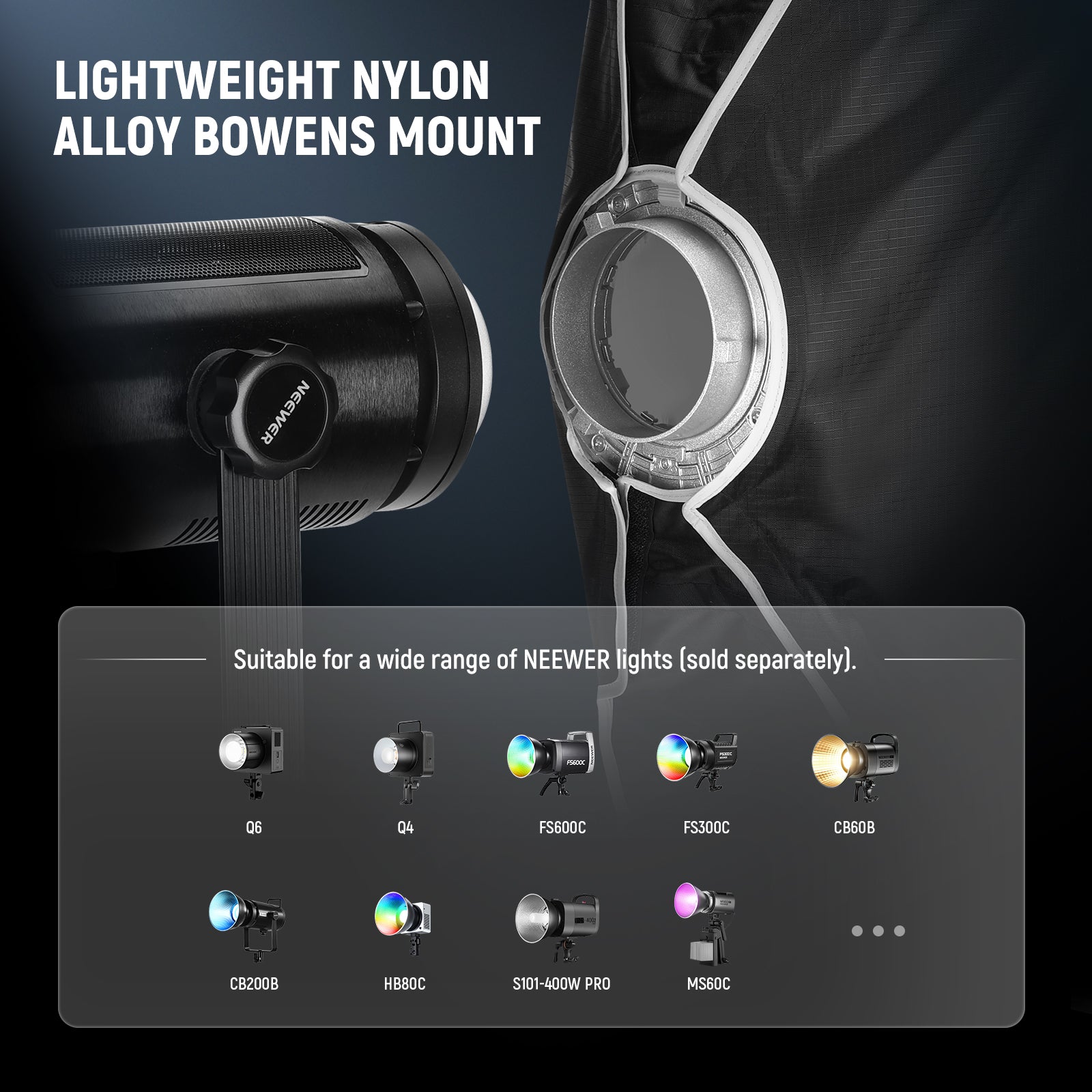 - Attach Via Bowens Mount- Connecting via Bowens mount, the softbox as photography gear is compatible with Aputure Amaran 150c, compatible with Godox SL60w, compatible with SmallRig RC 120D RC 120B and NEEWER FS600C FS300C FS230C FS150C FS300B FS230B FS150B CB200C HB80C CB60B MS60B MS60C Q6 Q4 Q200 Q300 S102 S101-400W PRO, and other studio strobe lights and continuous LED video lights with Bowens mount, for photography and videography lighting