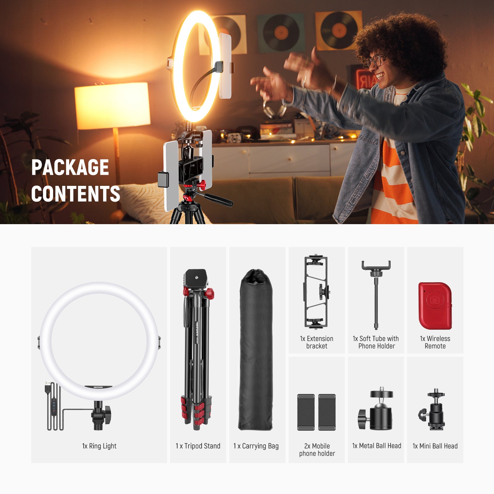 - Adjustable & Portable Tripod Stand- The 4 section aluminum alloy tripod extends from 15.7" to 54" (40-137cm) and folds down to 16.5" for easy transport as professional travel ring light. Quick release flip locks and a 3 way pan head with handle allow for fast height adjustment and precise ring light positioning. The pan head features a quick release plate for fast mounting and removal