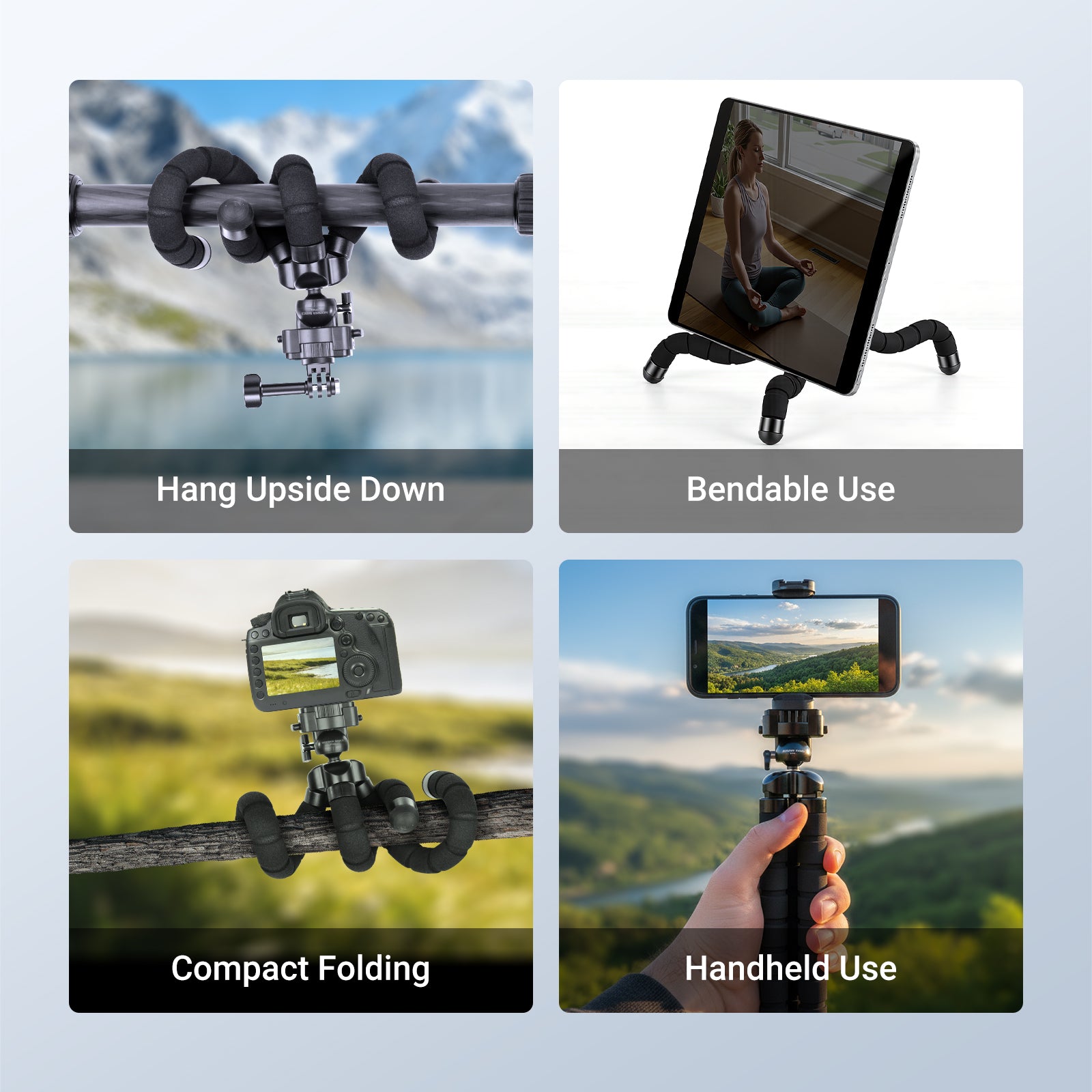- Flexible Phone Tripod- The cellphone holder desktop stand flexibly wraps around posts, branches, or handlebars. Bends or stretches to position your phone or action camera as desired, compatible with Canon Sony Nikon DSLRs, webcams. Max Load 2.2 lb (1 kg)