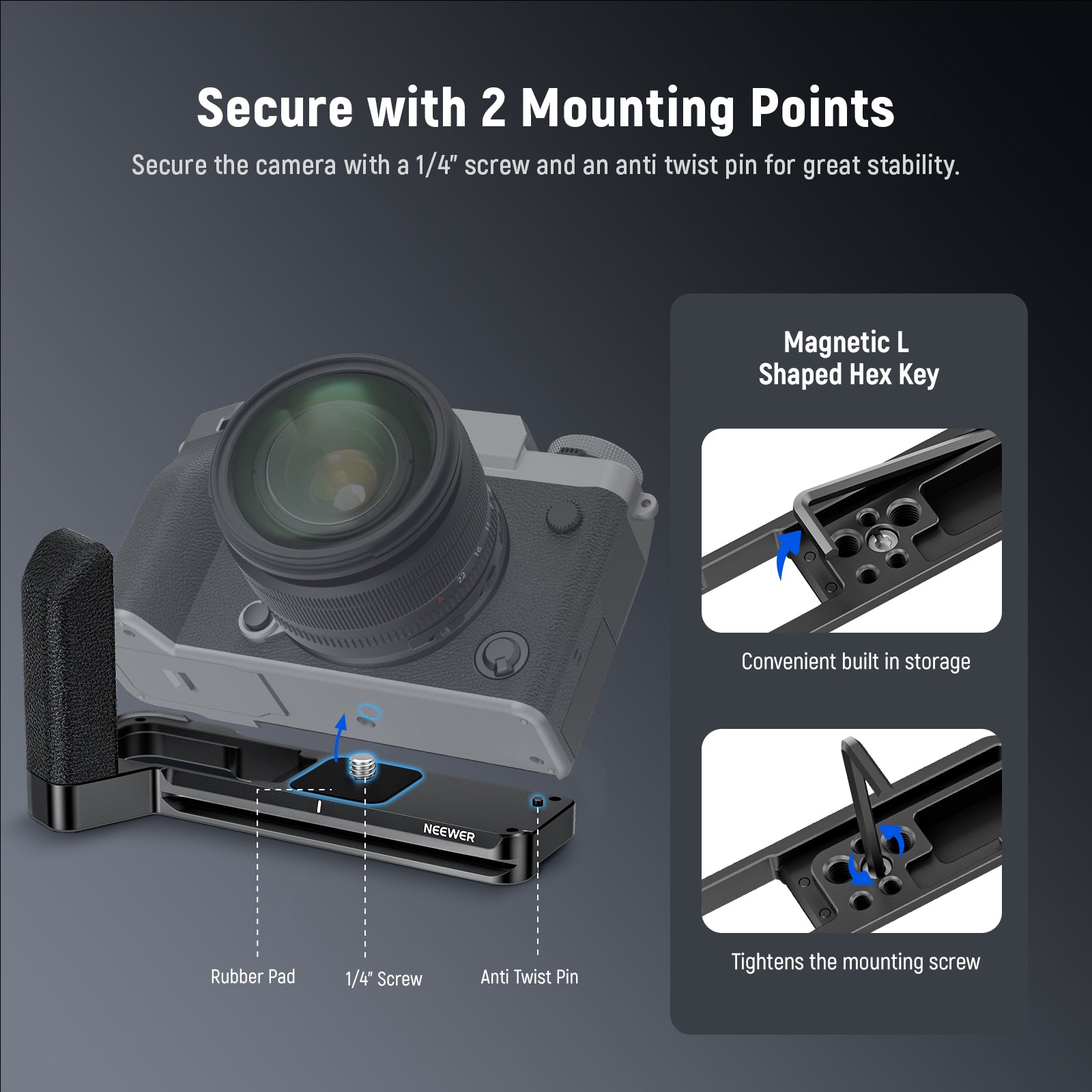 - Firm & Effortless Installation- The L plate firmly attaches to the camera through a 1/4" screw with a rubber pad to protect against scratches. An anti twist pin on the left can effectively prevent the camera from deflecting. And a magnetic L shaped hex key makes installing or removing the camera a breeze