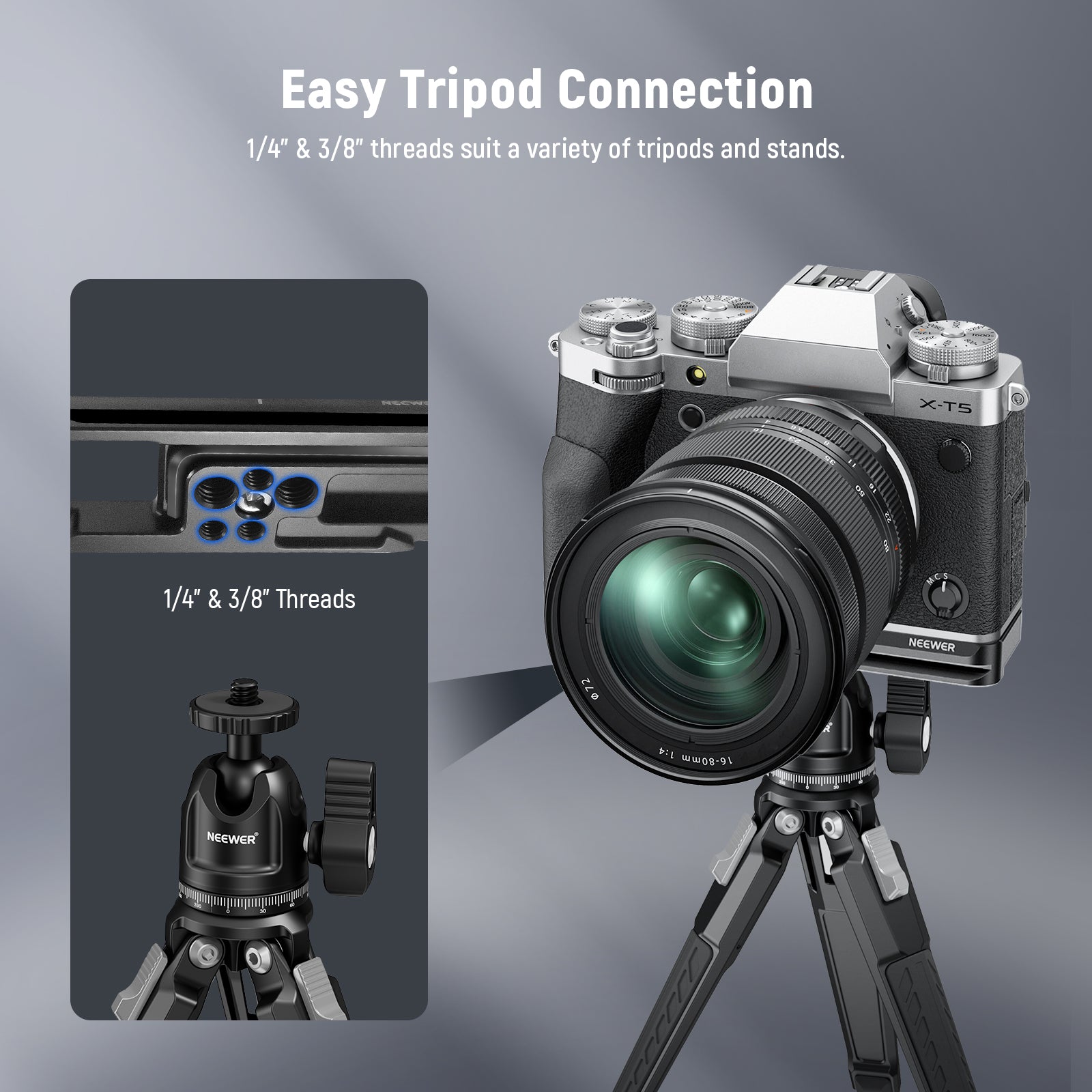- Multiple Mounting Threads- Four 1/4" threads and two 3/8" threads on the bottom can connect to tripods, handgrips, magic arms, and other accessories. An extra slot is for tying wrist straps