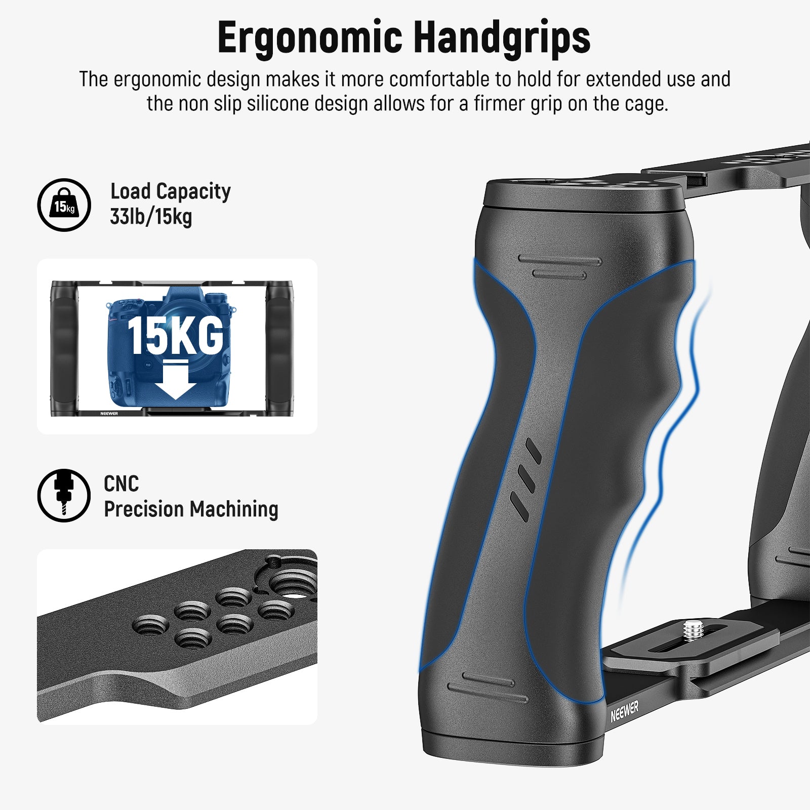 - Dual Grips & Tripod Mounted- The two ergonomic handgrips with synthetic leather texture and finger contours offer you a comfortable and firm grip on the cage for handheld shooting, or directly it on the tripod head via the 1/4" screw holes on the bottom, for seamless switching between handheld and tripod shooting, thanks to its Arca type base